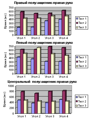 Программа выдает изображение приближенное к реальному (вратарь, ворота и фон стадиона изображены в фото-режиме), что позволяет спортсмену визуально ощутить знакомую обстановку, а также в ходе тестирования можно автоматически изменять освещение на стадионе, цвет формы спортсмена, введены варианты для различных сезонов года. Причем, смена положения вратаря на экране может производиться как по сигналу мыши тренером, а также компьютерной программой в периодическом режиме. Рис. 1. Результаты компьютерных тестов Нами было проведено пробное тестирование для нескольких возрастных групп спортсменов (футболисты 10-11, 12-13 и 14-15 лет) различной квалификации, во время которого были выявлены стойкие закономерности в полученных результатах. На рис. 1. представлены усредненные по трем попыткам результаты трех типов тестов (графики разного цвета) для игроков линии полузащиты (правого, левого полузащитников и центрального полузащитника). Возраст футболистов 14-15 лет. Количество ударов в каждой попытке-20 (длительность по времени 0.5 минуты). Удары по клавишам компьютера производились фиксированным пальцем правой руки. Углы пронумерованы в следующем порядке: угол №1- левый верхний от вратаря угол, угол №2- левый нижний от вратаря угол, угол №3- правый нижний от вратаря угол, угол №4- правый верхний от вратаря угол. На рисунке 1 по оси абсцисс указан угол, в котором находится вратарь (для первого и третьего тестов) и угол, отмеченный рамкой (для второго теста). Из анализа тестов видно, что правый полузащитник имеет более низкий временной показатель в первом и третьем тестах на смещение вратаря в правую сторону, когда открывается правый от вратаря угол. Это обусловлено тенденцией крайних игроков бить в дальний от них угол ворот противника. Аналогичная ситуация наблюдается для левого полузащитника: у него лучший показатель на смещение вратаря в левую сторону. А центральный полузащитник имеет приблизительно одинаковые показатели в обе стороны. Временные показатели второго теста по помещению мяча в прямоугольную рамку в одном из углов ворот намного превышают показатели остальных тестов. Что обусловлено визуальной трудностью восприятия и лишний раз доказывает роль естественности и сходства теста с реальной ситуацией. Этот тест не является обязательным. Неравномерность результатов теста обусловлена тем, что зоны действия крайних игроков расположены несимметрично по отношению к игровому полю. У футболистов, постоянно играющих на одном и том же фланге, может выработаться неадекватное видение поля, и в ходе тренировки им неплохо было бы менять амплуа. Неравномерное распределение внимания у спортсменов в разных направлениях может привести к поздней и неадекватной реакции на действия соперника, что в свою очередь ведет к проигранной игровой ситуации и повышенному травматизму. Поэтому выявление и устранение подобных недостатков необходимо для подготовки действительно универсальных спортсменов, соответствующих требованиям современного спорта, и должно проводиться на самых ранних стадиях тренировок. Рекомендации. Тестирование может проводиться циклически в ходе тренировок для выявления, анализа и выработки рекомендаций тренерам по устранению недостатков в подготовке игроков. В этом процессе должны участвовать специалисты разных професси