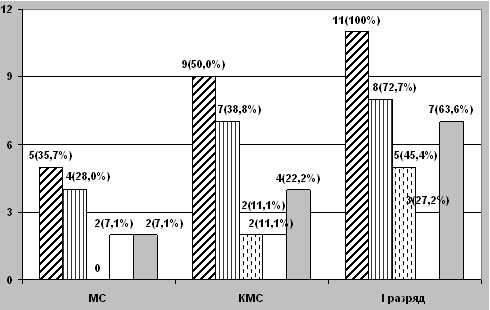 Методы получения информации: Результаты исследования. Всего было обследовано 43 спортсмена, занимающихся спортивными единоборствами, возрасте от 16 до 21 года, имеющие спортивную квалификацию: МС - 14 (32,5%) человек, КМС - 18 (41,8%) человек, 1 разряда - 11 (25,6%) человек. Как видно из представленных данных, повышенный уровень реактивной тревожности у МС - 5 спортсменов, что составляет 35,7%, у КМС - 9 (50,0%) спортсменов, у спортсменов 1 разряда - 11 (100%). Снижение уровня концентрации внимания: МС - у 4 (28,6%) спортсмена, КМС - 2 (11,1%) спортсмена,1 разряд - 8 (72,7%). Чувство паники испытывало 2 (11,1%) КМС, 5 (45,4%) спортсменов 1 разряда, у МС - не зафиксировано. Головокружение: МС - 1 (7,1%) спортсмен, КМС - 2 (11,1%) спортсмена, 1 разряд - 3 (27,2%) спортсмена. Чувство утомляемости: МС - 1 (7,1%) спортсмен, КМС - 4 (22,2%) спортсмена, 1 разряд - 7 (63,6%) спортсменов (рис.1). Учитывая результаты исследования, можно сделать вывод, что уровень стрессоустойчивости выше у спортсменов высокой квалификации. Это обусловлено более высоким уровнем психологической подготовки. Спортсменам низкой квалификации свойственно неумение регулировать свои психологические импульсы. Перед ответственными соревнованиями спортсмен находится в состоянии эмоционального напряжения, и он скорее может "сломаться" или по крайней мере результаты будут ниже потенциально возможных. На этом этапе спортсмен находится в состоянии предельного возбуждения. При таком состоянии психический стресс может возникнуть из-за незначительного раздражителя. Поэтому спортсмены высокого класса более эмоционально устойчивы и физически выносливы, легче противостоят стрессовым ситуациям. Для спортсменов высокого класса характерны черты личности: повышенная выносливость, эмоциональная стабильность, лучшая способность к саморегуляции и самоконтролю. В изучении индивидуальных реакций спортсменов на стрессовые ситуации необходимо учитывать как психологические комплексы, включенные в организацию приспособления и влияющие на весь комплекс биологических механизмов, так и исходные психологические особенности данного индивида, на фоне которых разворачивается процесс адаптации и которые влияют на этот процесс. В связи с этим к изучению психического стресса в спортивной деятельности имеет прямое отношение изучение индивидуальных особенностей личности спортсмена.