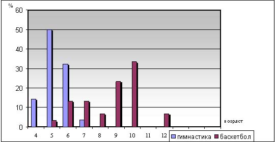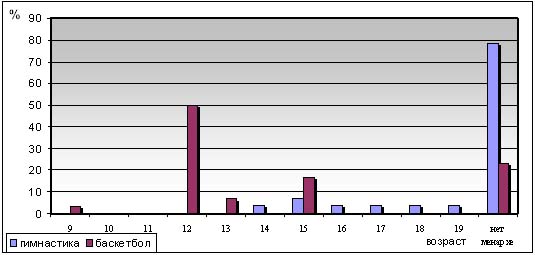 ВЛИЯНИЕ ТРЕНИРОВОЧНОЙ ДЕЯТЕЛЬНОСТИ НА РАЗВИТИЕ РЕПРОДУКТИВНОЙ СИСТЕМЫ ЮНЫХ СПОРТСМЕНОК Литисевич Л.В. Национальный университет физического воспитания и спорта Украины . В статье рассматривается вопрос о влиянии тренировочной деятельности на развитие репродуктивной системы спортсменок. Установлено, что среди юных спортсменок высокой квалификации одного паспортного возраста, специализирующихся в спортивной гимнастике и баскетболе, уровень полового созревания различен. У спортсменок 14 лет, специализирующихся в спортивной гимнастике в ряде случаев наблюдается задержка полового развития. У спортсменок 14 лет, специализирующихся в баскетболе, половое созревание по результатам исследований в пределах нормы. Установлена обратная зависимость между возрастом наступления менархе и началом тренировочной деятельности. Ключевые слова: тренировочная деятельность, репродуктивная система, половое развитие. Анотацiя. Лiтiсевич Л.В. Вплив тренувальноi дiяльностi на розвиток репродуктивноi системи юних спортсменок. У статтi розглядаеться питання про вплив тренувальноi дiяльностi на репродуктивну систему спортсменок. Установлено, що серед юних спортсменок високоi квалiфiкацii одного паспортного вiку, що спецiалiзуються в спортивнiй гiмнастицi й баскетболi, рiвень полового дозрiвання рiзний. У спортсменок 14 рокiв, що спецiалiзуються в спортивнiй гiмнастицi в рядi випадкiв спостерiгаеться затримка полового розвитку. У спортсменок 14 рокiв, що спецiалiзуються в баскетболi, полове дозрiвання за результатами дослiджень у межах норми. Установлено зворотну залежнiсть мiж вiком настання менархе й початком тренувальноi дiяльностi. Ключовi слова: тренувальна дiяльнiсть, репродуктивна система, статевий розвиток. Annotation. Litisevich L.V. Influence of training on reproductive system of young sportswomen. In the article consider question about influence of training on reproductive system of sportswomen. It fixed, that among juvenile sportsmen of tall qualification of one passport age, specializing in sports gymnastics and basketball, the level of a puberty is various. At sportsmen of 14 years specializing in sports gymnastics in some cases the delay of a sexual development is observed. At sportsmen of 14 years specializing in basketball, a puberty by results of researches in limens of norm. Inverse relationship between age of offensive menarche and the beginning of training activity fixed. Keywords: training, reproductive system, sexual development. Введение. В настоящее время тренировочные и соревновательные нагрузки достигли таких величин, что их воздействие на организм спортсменок находится на грани предельных возможностей индивидуальной адаптации [5]. В видах спорта, с ранней специализацией, большие физические и психологические нагрузки совпадают с возрастом 12-14 лет. Специалисты в области детской и подростковой гинекологии считают этот возраст "критическим", учитывая возрастающую активацию показателей как физического, так и полового развития [1;2;4]. Важный показатель возрастного развития девушек - возраст первой менструации (менархе), в течение года после которого происходит резкое торможение ростового процесса, а прироста массы - через 1,5 года [3]. Несмотря на актуальность рассмотренных вопросов, анализ литературных источников показал, что еще не до конца изучено влияние тренировочных нагрузок на физическое и половое созревание спортсменок, специализирующихся в отдельных видах спорта, предполагающих значительные физические нагрузки в период их полового созревания. Работа выполнена по плану НИР Национального университета физического воспитания и спорта Украины. Цель иссл