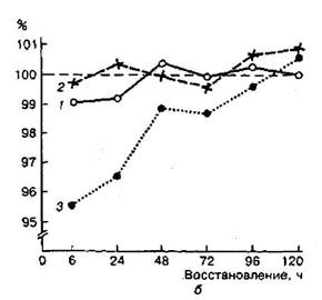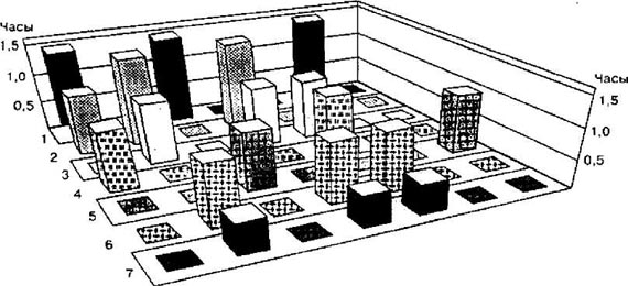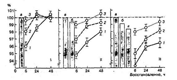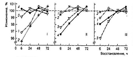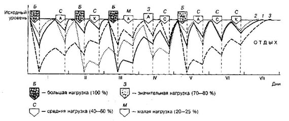 Рис.5. Функциональные возможности пловцов высокой квалификации после выполнения программы ударного микроцикла, направленной на повышение выносливости при аэробной работе: 1 - скоростные возможности; 2 - специальные силовые возможности; 3 - выносливость при аэробной работе Учет конкретного характера утомления является принципиально важным при планировании тренировочных микроциклов с большим количеством занятий и высокой суммарной нагрузкой, так как позволяет обеспечить одновременное выполнение следующих, принципиально важных для рациональной методики тренировки, условий: 1) создать предпосылки для оптимальной функциональной активности и работоспособности по отношению к работе конкретного занятия; 2) обеспечить необходимое соответствие между процессами утомления и восстановления, между стимулами к развитию адаптационных перестроек в организме спортсмена и условиями для их осуществления; 3) обеспечить характерное для спорта проявление отставленного тренировочного эффекта, развитие и сохранение устойчивой адаптации. Одним из наглядных примеров реализации такого подхода являются данные, приведенные на рисунке 6. Рис. 6. Рациональное чередование нагрузок различной направленности в недельном микроцикле при подготовке квалифицированных боксеров. Направленность нагрузки: 1 -технико-тактическая; 2 - развитие специальной выносливости; 3 - развитие общей выносливости; 4 -повышение координационных способностей; 5 - развитие гибкости; 6 - соревновательная; 7 - восстановительная (35) Особенно остро вопрос чередования нагрузок в микроцикле стоит в случае проведения в течение дня двух и более тренировочных занятий, что характерно для современного спорта в периоды особо интенсивной подготовки. Рационально спланированные двухразовые занятия позволяют не только существенно увеличить суммарный объем выполняемой работы без угрозы переутомления спортсменов, но и, главное, создать условия для качественного выполнения тренировочных упражнений в соответствии с требования эффективной методики совершенствования различных сторон подготовленности. Игнорирование основных закономерностей, лежащих в основе чередования работы и отдыха, может воспрепятствовать достижению результата, ожидаемого от интенсификации процесса тренировки. Происходит это чаще всего в двух случаях. Во-первых, когда нерационально чередуются занятия с различными по величине и направленности нагрузками, что приводит к быстрому переутомлению спортсменов. Во-вторых, когда направленность тренировочных занятий определяется без учета состояния организма спортсмена и влияния на него предыдущих занятий. При этом занятие часто проводится впустую, так как отсутствуют объективные предпосылки для проявления и развития у спортсмена тех или иных качеств и способностей, стимуляции соответствующих реакций адаптации. Высокая эффективность двухразовых занятий в течение дня наблюдается, если рациональным образом сочетаются нагрузки основных и дополнительных занятий, а увеличение общего количества занятий не сопровождается уменьшением количества занятий с большими нагрузками, которые служат мощным стимулом роста тренированности (рис. 7). Выводы. Проведение двух занятий в день является доминирующей формой организации тренировочного процесса при решении задач с