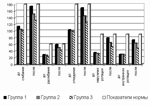 Примечание: достоверность различий внутри группы p<0,05. Исходные показатели гониометрии по всем показателям в группе 1 были немного лучше, чем в остальных двух группах: так в группе 1 - сгибание составило 113,6±19,0; разгибание - 28,4±5,5; отведение - 103,7±12,3; наружная ротация - 35,4±14,2; внутренняя ротация 29,5±7,6; p<0,05. В группе 2 - сгибание - 104,8±12,6; разгибание - 26,8± 5,8; отведение - 99,8±11,6; наружная ротация - 32,4±9,2; внутренняя ротация - 30,1±3,3; p<0,05. В группе 3 - сгибание составило 101,0±16,5; разгибание - 23,6±4,6; отведение - 98,8±18,0; наружная ротация - 30,4±6,7; внутренняя ротация - 27,0±7,3; p<0,05 (таблица 5). Все показатели гониометрии, как в группах, так и между ними достоверно различимы, однако при разгибании, исходные показатели между группой 1 и группой 3 не имели достоверных различий. Тем не менее, после проведения соответствующих комплексных программ физической реабилитации для каждой из групп, прирост показателей в группе 1 значительно лучше по сравнению с группой 2 и с группой 3 (при уровне достоверности по критерию Стьюдента p<0,05). Рис. 1. Динамика изменений двигательных функций плечевого сустава по отношению к норме Так, полученные данные после проведения эксперимента показали, что угол сгибания в группе 1 составил - 174,0±5,6, в группе 2 - 157,1±6.8, в группе 3 - 131,3±15,4; при разгибании в группе 1 показатель равен 59,0±2,3, в группе 2 - 49,3±4,9, в группе 3 - 42,0±7,4; угол отведения в группе 1 составил - 169,1±8,1, в группе 2 - 145,2±9,0, в группе 3 - 125,7±17,4; при наружной ротации показатели гониометрии были следующими: в группе 1 - 79,4±10,9, в группе 2 - 65,2±14,2, в группе 3 - 52,6±7,0; при внутренней ротации показатели гониометрии в группе 1 составили 72,8±в группе 2 - 63,4±9,0, в группе 3 - 48,0±9,4 (рисунок 1, таблица 5). Прирост показателей (Δ,%) в ходе эксперимента был следующим: в группе 1 - сгибание 57,2%, разгибание - 115,8%, отведение - 64,6%, наружная ротация - 153,5%, внутренняя ротация - 157,7%; в группе 2 - сгибание - 44,5%, разгибание - 90,0%, отведение - 46,8%, наружная ротация - 107,8%, внутренняя ротация - 110,5%; в группе 3 - сгибание 31,3%, разгибание - 78,8%, отведение - 28,6%, наружная ротация - 77,5%, внутренняя ротация - 83,1%. Выводы: По результатам предварительного эксперимента видно, что предложенная комплексная программа реабилитации №1 основанная на применении мануальной разработки контрактур плечевого сустава, наиболее эффективна, и данный способ лечения позволил добиться более высоких положительных результатов у пациентов группы 1 по сравнению с пациентами 2-й и 3-й групп. Мануальная разработка контрактур представляет собой эффективную методику физической реабилитации больных с контрактурами плечевого сустава. Применение данной методики позволило добиться наилучшего восстановления амплитуды движения в плечевом суставе, нормализовать трофику в области травмы, частично ликвидировать атрофию мышц поврежденной конечности, нормализовать осанку. В процессе работы мы выяснили, что с больными травматологического профиля необходимо работать исключительно индивидуально, а не собирать их в группы с ориентировкой на однородность заболевания. Постиммобилизационные, посттравматические контрактуры сустава невозможно разработать без пересечения болевой границы. Для того, чтобы уменьшить болевые ощущения у пациентов во время выполнения методики мануальной разработки широко применяются физиотерапевтические процедуры и массаж. Применение методики мануальной разработ