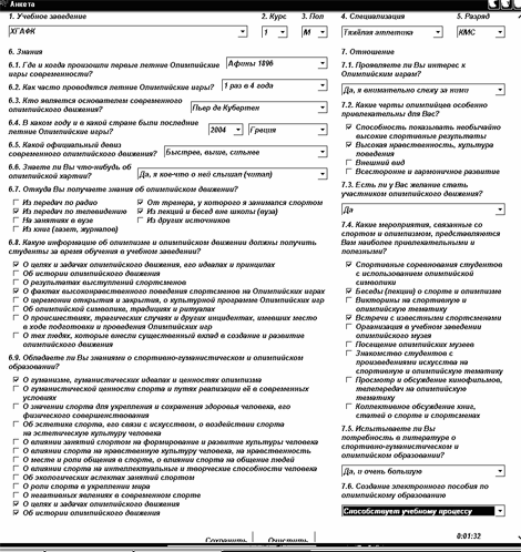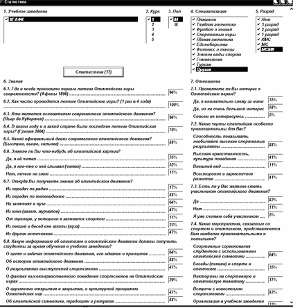 АНКЕТИРОВАНИЕ СТУДЕНТОВ ВЫСШИХ УЧЕБНЫХ ЗАВЕДЕНИЙ ФИЗИЧЕСКОЙ КУЛЬТУРЫ И СПОРТА ПО ОЛИМПИЙСКОМУ ОБРАЗОВАНИЮ В УСЛОВИЯХ ИНТЕНСИВНОГО ИСПОЛЬЗОВАНИЯ КОМПЬЮТЕРНЫХ ТЕХНОЛОГИЙ Касьяненко О.Г. Национальный университет физического воспитания и спорта Украины . Описывается компьютерная анкета для студентов высших учебных заведений физической культуры и спорта по олимпийскому образованию, включающая программу "Questions" - форма анкеты с вопросами и пустыми полями для ответов и программу "Statistica" - с помощью которой данные статистически обрабатываются. Ключевые слова: компьютеризация, анкета, олимпизм, статистика. Анотацiя. Касьяненко О.Г. Анкетування студентiв вищих навчальних закладiв фiзичноi культури й спорту з олiмпiйськоi освiти в умовах iнтенсивного використання комп'ютерних технологiй. Описуеться комп’ютерна анкета для студентiв вищих навчальних закладiв фiзичноi культури та спорту з олiмпiйськоi освiти, що включае: програму "Questions" - форма анкети з питаннями та порожнiми полями для вiдповiдей та програму "Statistica" - за допомогою якоi даннi статистично обробляються. Ключовi слова: комп’ютеризацiя, анкета, олiмпiзм, статистика. Annotation. Kasyanenko O.G. Questioning of students of higher educational institutions of physical training and sports on Olympic educational in conditions of a heavy use of computer technologies. Describes computer questionnaire for students of high educational institutions of physical culture and sport by Olympic education, includes program "Questions" - the questionnaire form with questions and empty columns for answers and program "Statistica" - with which facts are statistical calculated. Keywords: computerizing, questionnaire, olympizm, statistic. Введение. Компьютерные технологии применяются во всех областях деятельности человека и определяют прогресс развития современного общества. Использование их в практике повышает работоспособность людей и результативность их труда. Информатизация сферы образования сопровождается интенсивным внедрением информационных технологий, основанных на применении компьютеров, причем не только в технических высших учебных заведениях, но и в высших учебных заведениях физической культуры и спорта [2, 11]. Создание компьютерных учебников, учебных пособий, методического обеспечения дисциплины, компьютерных средств контроля знаний студентов и оценки качества усвоения учебного материала, тематических баз данных, направленных на информационную поддержку учебной дисциплины является путями внедрения информационных технологий [4, 5, 10]. Среди них важное место принадлежит созданию программных продуктов по вводу и статистической обработке данных [1]. Одной из разновидностей данных продуктов является компьютерное анкетирование. Анкетирование - это метод получения информации путем письменных ответов респондентов на систему стандартизированных вопросов [3]. Современные компьютерные системы являются способом унификации представления информации. Они позволяют обрабатывать численные данные, хранить их в большом объеме и автоматизировать процесс обработки результатов данных [7]. Это намного упрощает процесс проведения и обработки анкетирования. Проведенный теоретический анализ и обобщение литературных источников свидетельствует о том, что проведению анкетирования по вопросам олимпийского образования посвятили свои работы многие ученые [8, 9]. Еще в 80-х годах профессором Столяровым В.И. [9] был проведен массовый социологический опрос по данной тематике. Значительное количество его последователей [8, 9] продолжили исследования 