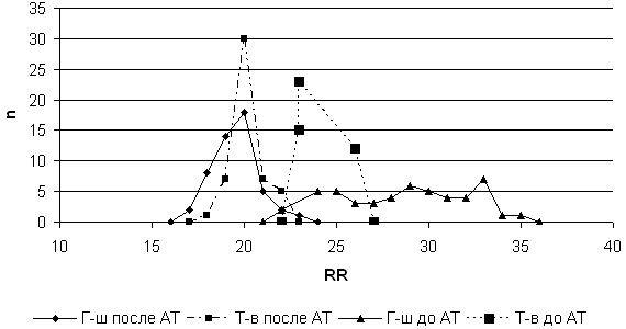 Рис. 1. Примеры индивидуальных изменений показателей сердечного ритма студентов при проведении сеанса аутогенной тренировки на первой неделе практики (RR - длительность RR-интервалов в сердечном ритме, мс; n - частота встречаемости RR-интервалов В контрольной группе достоверных изменений показателей сердечного ритма не наблюдалось. Изменения сердечного ритма под воздействием АТ носят индивидуальный характер (рис. 1). Разница между индивидуумами состоит в степени изменений сердечного ритма и времени начала активизации симпатического отдела вегетативной нервной системы. Полученные данные свидетельствуют об индивидуальном влиянии аутогенной тренировки и наиболее адекватных изменениях, вызываемых практикой АТ. Предложенная методика аутогенной тренировки является фактически тренингом внутренних ведений. В настоящее время уже доказано, что тренинг внутренних видений имеет большое значение для людей различных специальностей, и особенно к такого рода практикам склонны люди с гуманитарным, художественно-образным складом ума. Известно, например, что актерам, писателям, художникам, всем людям образного мышления - привычно обращение к внутренним видениям. Еще М. Ломоносов писал: "Больше всего служат к движению и возбуждению страстей живо представленные описания, которые очень в чувства ударяют, и особенно как бы действительно в зрении изображаются" [6]. Некоторые авторы [6,7,11] выявили, что воздействие слова тем эффективнее, чем более оно "заряжено", т.е. образно окрашено. Подготовленное микроречью, возбужденное видениями такое слово приводит к большему биологическому потенциалу систем, обеспечивающих необходимое действие, и обуславливает повышенную возбудимость определенных участков коры головного мозга [7,11]. Эмоционально окрашенные следовые процессы сначала вызываются сознательно, потом возникают непроизвольно, и в этот момент тормозятся реальные воздействия внешней среды. Замыкательная функция осуществляется тогда во второй сигнальной системе, но уже вне осознанного восприятия [7]. Механизм внушения открывает свойства следовых процессов, одно из которых - запоминание действий и состояний организма в прямой последовательности и связи по времени, причем при повторении цепи действий кора головного мозга пускает в ход те связи, которые существовали в моменты этих действий, и позволяет внушенным процессам в нужный момент времени. Если внушение реализуется в бодрствующем состоянии человека и восприятие становится осознанным, обязательно нужно, чтобы спортсмен верил в пользу дела, хотел принять внушение и, таким образом, чтобы он сам поддерживал связь между собой и внушающим. Примечательно, что человеку невозможно внушить (даже в состоянии гипнотического сна) какие-нибудь представления и действия, находящиеся в противоречии с его убеждениями, с его этическими нормами. Полученные результаты в нашем исследовании свидетельствуют о положительном воздействии практики аутогенной тренировки на адаптационные процессы студентов. Выводы. 1. Выявленные изменения показателей сердечного ритма свидетельствуют о гармонизирующем влиянии разработанной методики восстановления на состояние сердечно-сосудистой и нервной систем студентов. 2. Аутогенная тренировка в авторской модификации вызывает изменения, необходимые для эконо