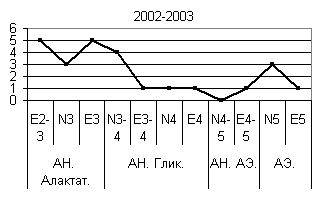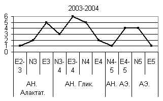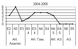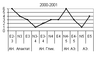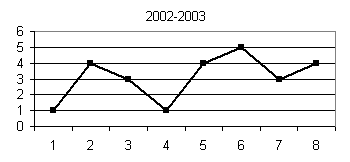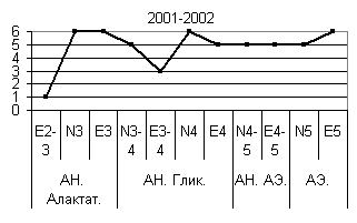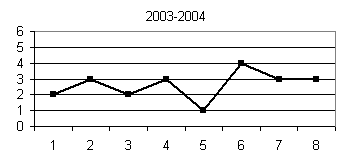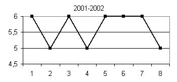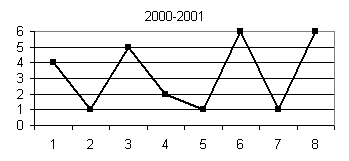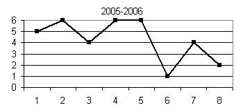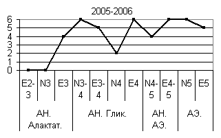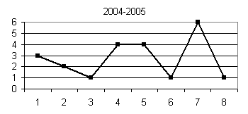 Рис 1. Реализация различных видов нагрузки на максимальном уровне по тренировочным сезонам 2000-2006 года. По вертикали - уровень (ранг), по горизонтали − средства подготовки, правый столбец акцентирование нагрузки по метаболическим режимам Смирнова М.Р. [5]: 1) анаэробная алактатная (АН. Алактат), 2) анаэробная гликолитическая (АН. Глик.), 3) анаэробно-аэробная (АН. АЭ.), 4) аэробная (АЭ), 5) силовые, 6) скоростно-силовые, 7) ОРУ, 8) Игровые тренировки.. По количеству средств, реализованных на максимальном уровне, сходными оказались: олимпийские сезоны 2001-2002 гг. и 2005-2006 гг. - от трех до пяти показателей находились на максимальном уровне, что составляет 37,5%-62,5% соответственно; предолимпийские сезоны 2000-2001 гг. и 2004-2005 гг. - до двух показателей из восьми находились на максимальном уровне, т.е. от 12,5% до 25%; первые два года олимпийского цикла - сезоны 2002-2003 гг. и 2003-2004 гг. - показателей на максимальном уровне зафиксировано не было. По данным В.С. Рубина [3] для тренировочного процесса спортсменов высокой квалификации характерно применение 50-60% средств на максимальном уровне, этому соответствовал олимпийский сезон 2001-2002 года 62,5%. Что касается направленности годичных циклов подготовки и темпов прироста парциальных нагрузок, то по полученным данным прослеживается следующая картина. В предолимпийском сезоне 2000-2001 гг. на максимально высоком уровне за шестилетие были реализованы парциальные нагрузки смешанной аэробно-анаэробной направленности и силовые средства подготовки. При этом на уровне, не ниже среднего, были выполнены объемы работы анаэробной алактатной, силовой работы и игровых тренировок. В структуре нагрузок анаэробной алактатной направленности преобладали метаболические режим Е2-3, что указывает на преимущественное развитие емкости. Для анаэробно-аэробной направленности было характерным развитие мощностного режима N4-5. Данные режимы были реализованы на максимальном уровне и составили 11%. Олимпийский сезон 2001-2002 года наиболее соответствовал данным приводимым Рубиным В.С. [3], на максимально высоком уровне за шестилетие были реализованы парциальные нагрузки анаэробной алактатной, анаэробно-аэробной направленности, а также скоростно-силовой, силовой работы и ОРУ. На уровне выше среднего находились игровые тренировки, а также анаэробная гликолитическая и аэробная направленность. В анаэробной алактатной направленности мощностной N3 и емкостной режимы Е3 были реализованы на максимальном уровне. Также на максимальном уровне в данном сезоне были реализованы метаболические режимы N4 (мощностной) в анаэробной гликолитической направленности и емкостной режим Е5 в анаэробной направленности. В послеолимпийском сезоне 2002-2003 года реализации групп средств на максимальном уровне зафиксировано не было. Анаэробная гликолитическая, аэробная направленность, а также скоростно-силовые, силовые средства, игровые тренировки и ОРУ находились на уровне выше среднего. В метаболических режимах на уровне выше среднего были реализованы емкостные режимы Е2-3 и Е3 анаэробной алактатной направленности, а также мощностной режим N3-4 анаэробной гликолитической направленности. В сезоне 2003-2004 года на уровне выше среднего были реализованы только скоростно-силовые средства. Анаэробная гликолитическая, аэробная направленность, ОРУ и игровые тренировки находились на среднем