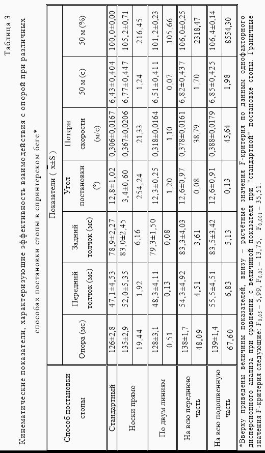 *Момент самого низкого положения голеностопного сустава. **Момент перехода от переднего толчка к заднему толчку (от амортизации к отталкиванию). Постановка стопы носками прямо вперёд, а также на всю переднюю и всю подошвенную часть привела к значительному увеличению времени опоры и выраженным потерям скорости в фазе амортизации, а также увеличению времени преодоления всей дистанции в процентном отношении. Отличий времени преодоления всей дистанции в абсолютных единицах во всей исследовавшейся группе не обнаружено в связи с тем, что абсолютные результаты у мужчин и женщин отличались сильнее, чем при различных способах постановки стопы. Следует отметить, что если общее время опоры увеличилось достоверно при всех названных вариантах постановки стопы, то время переднего толчка (амортизации) достоверно увеличилось только при постановке стопы на всю подошвенную часть, а время заднего толчка (отталкивания) - только при постановке носками прямо вперёд. Очевидно, это явилось следствием некоторой разнонаправленности изменений названных показателей у различных испытуемых. Общее же увеличение времени опоры свидетельствует об изменении оптимального для обследованных спринтеров сочетания длины (её увеличения) и частоты шагов (её снижения). Это, как следует из динамики времени преодоления всей дистанции в процентном отношении, негативно сказалось на скорости бега в целом. Выводы. 1. Современные элитные спринтеры применяют следующие способы постановки стопы на опору: на переднюю внешнюю часть стопы и всю внешнюю часть стопы. При этом в беге по прямой в подавляющем большинстве случаев ведущие спринтеры ставят стопу под углом к направлению движения (носками, развёрнутыми наружу). Постановка стопы на всю подошвенную часть носком прямо вперёд применяется в прыжках в длину и тройным, когда требуется приобретение значительной вертикальной скорости, резкое изменение направления движения с "вперёд" на "вперёд-вверх". 2. В результате биомеханического моделирования установлено, что постановка стопы носком прямо вперёд должна приводить к увеличению силы амортизации, направленной против движения, что, в свою очередь, приведёт к снижению скорости бега. Постановка стопы под углом к направлению движения должна приводить к возникновению в фазе амортизации (переднего толчка) вращательного момента и, как следствие, к выраженному вращению стопы вокруг вертикальной оси, проходящей через её переднюю (опорную) часть, что позволит уменьшить силу амортизации, и потому является более предпочтительной. 3. Спринтеры, имеющие квалификацию мастер спорта, кандидат в мастера спорта и первый разряд, применяют те же способы постановки стопы, что и элитные спринтеры: на переднюю внешнюю часть стопы или всю внешнюю часть стопы, при этом стопа ставится под выраженным углом к направлению движения (с носком, развёрнутым наружу). После постановки стопы на переднюю внешнюю часть происходит опускание на всю переднюю часть, а затем, в зависимости от уровня скоростно-силовой подготовленности мышц-сгибателей стопы, происходит либо не происходит касание дорожки пяткой (опускание на всю подошвенную часть). После постановки на всю внешнюю часть стопы происходит опускание на всю подошвенную часть. Это позволяет снизить силу амортизации в начале переднего толчка и с