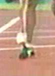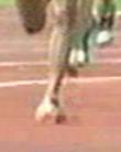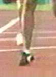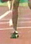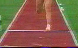 Рис. 2. Постановка стопы Гвен Торренс (Олимпийские игры 1996 года) При постановке стопы со всей внешней части далее следует её опускание на всю подошвенную часть (рис. 2, кадр 3). Рекомендуемая многими специалистами постановка стопы носком прямо вперёд (и даже носком внутрь - Х. Дрехслер) была отмечена при постановке ноги на отталкивание в прыжках в длину и тройным (Л. Галкина (рис. 3), С. Каспаркова, Д. Грин), когда требуется изменение направления движения с "вперёд" на "вперёд-вверх", увеличение длины последующего шага-прыжка.