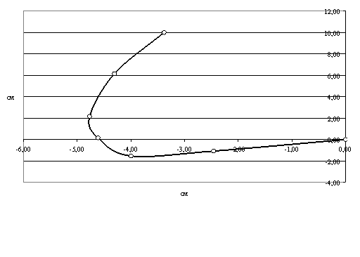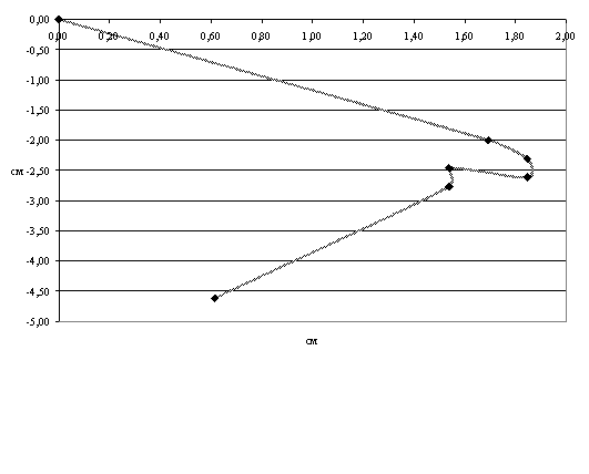 Рис. 6. Траектория маркера во фронтальной плоскости (вид спереди), укреплённого на дистальной точке носка правой шиповки, за время опоры в спринтерском беге (мужчина, 1 разряд; постановка со всей внешней части стопы; за "0" приняты координаты маркера при касании опоры) Таблица 2 Угол между стопой и направлением движения бегуна-спринтера в различные моменты опорного периода