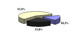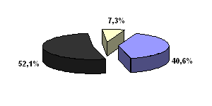 Рис. 1. Диаграмма оценивания студентами своих знаний относительно формирования у молодежи навыков здорового образа жизни. Условные обозначения: синий - имеют достаточные знания черный - имеют недостаточные знания желтый - отсутствуют знания Оказалось, что соотношение тех, кто считает свои знания по вопросам валеологического воспитания школьников достаточными, за период учебы в ВУЗе увеличилось вдвое. Из диаграммы видим, что большая половина будущих учителей (52,1% из числа исследуемых) засвидетельствовала низкий уровень готовности к передаче ученикам знаний валеологического содержания. Характерными признаками были такие, что студенты V курса не имели еще достаточных знаний относительно формирования у молодежи навыков здорового образа жизни и потому их знания носили преимущественно мозаичный характер. В одних вопросах относительно здравоохранения будущие учителя имели поверхностные понятия и представления, в других - чувствовали значительные трудности относительно объяснения их сущности и содержания. 7,3% выпускников считают, что у них отсутствуют знания валеологического направления и они не готовы к воспитательной работе с учениками. Для получения объективных данных в цифровом выражении относительно готовности студентов к валеологическому воспитанию, нами для каждого респондента рассчитывался коэффициент готовности (КГ) за формулой: Результаты тестирования студентов представлены в таблице 1. Таблица 1 Результаты тестирования студентов