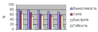Год Рис. 1. Уровень показателей физических качеств у студентов 1-х курсов После прохождения медицинского осмотра студенты первых курсов распределяются в группы специализации по видам спорта. Атлетическая гимнастика входит в одно из трех основных направлений двигательной активности при организации занятий в Харьковском национальном университете имени В. Н. Каразина. Основная функция занятий атлетической гимнастикой на начальном уровне заключена в создании общего фундамента подготовки, предпосылок для установления хорошей физической формы. Главное - это вовлечение организма студента в активную работу, повышение уровня его функционального состояния и улучшение здоровья. Силовые тренировки бывают общими или раздельными (по сплит-системе). В период подготовительной работы для студентов первых курсов применяется общая тренировка. В ходе общей тренировки прорабатываются все группы мышц за одно занятие. Основная часть такого тренировочного времени приходится на базовые упражнения. Базовые("многосуставные") - это "стержневые" упражнения, способствующие наиболее эффективному воздействию на человеческий организм и нагружающие большой массив мускулатуры. Они являются основными для наращивания мышц. К ним относят приседания, становую тягу, жим ногами, жим лежа (в разных положениях тела), отжимания на брусьях, подтягивания. Базовые упражнения закладывают фундамент атлетичной мускулатуры и должны присутствовать в каждой тренировке. Максимальная частота для этих упражнений - дважды в неделю или три раза каждые две недели. Прогресса в тренировочном занятии можно добиться, используя основные принципы тренировочного процесса (от простого к сложному, вариативность, постепенность, регулярность и т. д.). В первую очередь - это увеличение рабочей нагрузки в тренировочном занятии. Опытным путем было определено, что упражнения для начинающих должны повторяться 8-12 раз в подходе (серии). Если вы не можете выполнить 8 повторений, то выбранный вес пока для вас велик, если делаете более 12 раз, надо увеличить отягощение. Как правило, увеличивать вес необходимо не более, чем на 5 % от исходного веса. Упражнения необходимо выполнять до появления в работающей мышце ощущения кратковременной мускульной слабости (момента бессилия). Она появляется тогда, когда временно невозможно выполнить следующее повторение упражнения технически правильно. При выполнении 12 и выше повторений в одном подходе происходит уменьшение слоя подкожного жира и оформление мышечной массы (упругость, эластичность). Составление учебной программы зависит от решаемой задачи (для начального, среднего и высокого уровня подготовленности занимающихся). В занятиях очень важно избегать перенапряжения и выполнять упражнения правильно, чтобы не перегружать суставы. Боль в суставах может привести к серьезной травме. В этом случае занятия необходимо прекратить. Усталость во время нескольких последних повторений упражнений или мышечная боль - нормальное явление. Это вызвано наличием образовавшейся в этом процессе молочной кислоты. Ресинтез молочной кислоты происходит в интервалах между сетами и в период отдыха между тренировками. Примерный комплекс с базовыми упражнениями для всех групп мышц