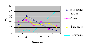 При оценке физического состояния студентов на удовлетворительно и выше, на первом месте стоит физическое качество - выносливость. Далее следуют показатели силы, быстроты и гибкости. Рис. 1. Соотношение между оценками физических качеств студентов в 2007/08 уч. г. Показатели гибкости (способность человека выполнять все движения с большой амплитудой) - на последнем месте. Целью работы является поиск путей улучшения физического качества гибкость у студентов старших курсов вузов. Результаты исследования. Исследования проводились в начале и в конце весеннего семестра 2007/08 учебного года с использованием теста - наклоны туловища вперед из положения сидя. В исследовании принимали участие студенты института высоких технологий Харьковского национального университета имени В. Н. Каразина и Харьковского национального университета радиоэлектроники. В занятия для развития гибкости в начале 2007/08 учебного года, наряду с динамическими и статическими упражнениями общего характера, были включены энергетические упражнения для комплексного воздействия на организм из гимнастики школы "У-шу" [3]. Эти упражнения сочетают в себе разминочное воздействие на суставы, мышцы и сухожилия с дыхательной гимнастикой, элементами акупрессуры и общего массажа. Поэтому эффективность этих упражнений существенно выше, чем у европейских гимнастик. Занятия гимнастикой "У-шу" имеют большое оздоровительно-профилактическое значение, оказывают положительное психофизическое воздействие (что также немаловажно), доступны людям с различным уровнем физической подготовки. В предлагаемом комплексе, используя весь набор упражнений, можно не только размять в правильной последовательности все суставы, мышцы, сухожилия, но и "проработать" кровеносную и нервную системы, внутренние органы. При выполнении упражнений необходимо концентрировать внимание на самом движении и на рекомендуемый участок тела. Это важный элемент в освоении искусства управления "внутренней энергией" организма. Предлагаются некоторые упражнения из этого комплекса. Цель этих упражнений заключается в том, чтобы в организме был полный энергетический баланс. 1. И. п. - узкая стойка, правая рука поднята вверх, кисть расположена горизонтально, пальцы как бы собраны в щепотку; левая рука опущена вниз, кисть ее максимально отогнута вверх, ладонь повернута вниз, параллельна полу и полностью распрямлена. На вдохе два раза отводим руки максимально назад. Затем меняем положение рук и на выдохе повторяем махи руками. При выполнении упражнения руки в локтях не сгибать, а "верхнюю" руку максимально приблизить к голове, так, чтобы при взмахе касаться ею уха. 2. И. п. - узкая стойка, руки согнуты в локтях и сложены на затылке так, что большие пальцы упираются в подзатылочные ямки (точка иглотерапии фэн-чи), остальные пальцы сцеплены. Голову держать прямо, локти максимально отведены назад. Сохраняя фиксированное положение головы и ступней, выполнить 7 круговых движений тазом против часовой стрелки. Движение таза вперед соответствует вдоху, а назад - выдоху. Ноги в коленях не сгибать. Затем выполнить вращение по часовой стрелке. 3. И. п. - о. с., ноги согнуты в коленях, кисти рук плотно обхватывают колени, туловище слегка наклонено вперед, смотреть прямо перед собой. Выполнять с максимальной амплитудой круговые движения в коле