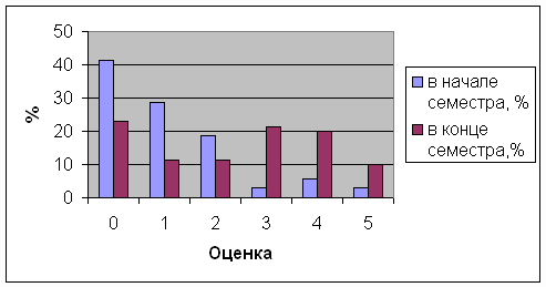 Рис. 2. Соотношение между оценками физического качества гибкость у студентов в начале и в конце весеннего семестра 2007/08 уч. года Выводы. Результаты тестирования показали, что после применения энергетических упражнений из восточной гимнастики "У-шу", физическое состояние студентов заметно улучшилось. По показателям оценок физического качества гибкость количество студентов, ранее получивших оценку неудовлетворительно и ниже, сократилось почти вдвое. Соответственно выросло количество студентов, получивших оценки выше удовлетворительных. Таким образом, включая в занятия по физическому воспитанию, наряду с традиционными упражнениями для развития гибкости, энергетические упражнения из восточной гимнастики, можно не только улучшить это физическое качество, но и значительно повысить мышечный тонус всего организма студента. Дальнейшие исследования предполагается провести в направлении изучения других проблем физического состояния студентов. Литература
