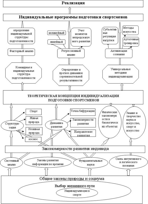 АНАЛИЗ И ОБОБЩЕНИЕ РЕЗУЛЬТАТОВ ПРАКТИЧЕСКОЙ РЕАЛИЗАЦИИ КОНЦЕПЦИИ ИНДИВИДУАЛЬНОГО ПОДХОДА В ТРЕНИРОВОЧНОМ ПРОЦЕССЕ В СПОРТИВНЫХ ИГРАХ Козина Ж.Л. Харьковский национальный педагогический университет им. Г.С. Сковороды . Разработана теоретическая концепция индивидуализации тренировочного процесса, которая основана на системном анализе, закономерностях развития самоорганизующихся систем, законах развития информации, законах фундаментальных наук, связи логической и интуитивной форм познания. Концепция заключается в выделении ведущих факторов в индивидуальной структуре подготовленности спортсменов, в анализе закономерностей и прогнозе индивидуальной динамики соревновательной результативности и разработке универсальных методик индивидуализации тренировочного процесса. Применение системы индивидуализации подготовки спортсменов оказало положительное влияние на показатели специальной физической и технической подготовленности, показатели соревновательной эффективности, показатели вегетативного баланса, ортостатической устойчивости, эффективности функционирования адаптивных систем организма и показатели работоспособности спортсменов. Ключевые слова: концепция, индивидуализация, спортивные игры, баскетбол, волейбол, функциональные возможности, адаптация, вегетативный баланс, соревновательная эффективность, надежность. Анотацiя. Козiна Ж.Л. Аналiз i узагальнення результатiв розробки i практичноi реалiзацii теоретичноi концепцii iндивiдуалiзацii пiдготовки спортсменiв в спортивних iграх. Розроблена теоретична концепцiя iндивiдуалiзацii тренувального процесу, яка заснована на системному аналiзi, закономiрностях розвитку систем, що самоорганiзуються, законах розвитку iнформацii, законах фундаментальних наук, зв'язку логiчноi i iнтуiтивноi форм пiзнання. Концепцiя полягае у видiленнi провiдних факторiв в iндивiдуальнiй структурi пiдготовленостi спортсменiв, в аналiзi закономiрностей i прогнозi iндивiдуальноi динамiки змагальноi результативностi i розробцi унiверсальних методик iндивiдуалiзацii тренувального процесу. Застосування системи iндивiдуалiзацii пiдготовки спортсменiв надало позитивний вплив на показники спецiальноi фiзичноi i технiчноi пiдготовленостi, показники змагальноi ефективностi, показники вегетативного балансу, ортостатичнiй стiйкостi, ефективностi функцiонування адаптивних систем органiзму i показники працездатностi спортсменiв. Ключовi слова: концепцiя, iндивiдуалiзацiя, спортивнi iгри, баскетбол, волейбол, функцiональнi можливостi, адаптацiя, вегетативний баланс, змагальна ефективнiсть, надiйнiсть. Annotation. Kozina Z.L. Analysis and generalization of results of development and practical realization of theoretical conception of individualization of preparation of sportsmen in sporting games. Theoretical conception of individualization of training process, which is based on the analysis of the systems, conformities to the law of development of the self-organization systems, laws of development of information, laws of fundamental sciences, connection of logical and intuitional forms of cognition, is developed. Conception consists in the selection of leading factors in the individual structure of preparedness of sportsmen, in the analysis of conformities to the law and prognosis of individual dynamics of competition effectiveness and development of universal methods of individualization of training process. Application of the system of individualization of preparation of sportsmen was rendered by positivstaide influence on the indexemetrics of the special physical and technical preparedness, indexes of competition efficiency, indexes of vegetative balance, to orthostatic stability, to efficiency of functioning of the adaptive systems of organism and indexes of capacity of sportsmen. Keywords: conception, individualization, sporting games, basket-ball, volley-ball, functional possibilities, adaptation, vege