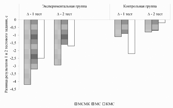 Примечание * р<0,05. Обсуждение результатов исследований. Анализ изменений результативности соревновательной деятельности и рейтинга гребцов экспериментальной группы по отношению к спортсменам, которые не использовали программу специальной силовой подготовки показал, что все спортсмены экспериментальной группы улучшили не только спортивно-технический результат, но и индивидуальные рейтинги. Без изменений ранга остался один спортсмен (Ян, Китай), который после начального тестирования занимал 1 место в рейтинге элитных спортсменов. При этом он значительно улучшил собственный результат на дистанции 500 м с индивидуальной раскладкой сил и увеличил отрыв по времени преодоления дистанции от других спортсменов его квалификационной группы. Следует также отметить, что спортсмен Мон (Китай), квалификации МСМК, который имел третий результат в прохождении соревновательной дистанции 500 м после заключительного тестировании перешел на вторую позицию. Эффективность методики специализированной силовой подготовки подтвердил сравнительный анализ результатов контрольной и экспериментальной групп. Результаты выполнения двух тестовых заданий спортсменов, которые не использовали специальную программу силовой подготовки были достоверно не изменились Cпортсмены, которые не использовали специальную программу подготовки, направленную на реализацию силового потенциала гребцов на каноэ подготовки имели низкий прирост спортивно-технических результатов (по времени преодоления двух тестовых дистанций) и индивидуальных рейтингов спортсменов (по сравнению суммы рангов). Наиболее отчетливо это видно по способности к реализации силового потенциала у спортсменов квалификационных групп МСМК и МС. У этих гребцов отмечена только некоторая тенденция к связи показателей начального и контрольного тестирования гребцов. Можно предположить, что эти изменения отражают естественную динамику функциональных возможностей, типичную для этого периода подготовки. Достоверные различия показателей начального и контрольного тестового задания с выраженным силовым компонентом движения у кандидатов в мастера спорта связаны с тем, что эти спортсмены предварительно выполнили программу развития специального силового потенциала. Это подтверждает эффекты экспериментальной программы, направленной на развитие силового потенциала гребцов представленные в литературе ранее [1,2]. Обобщенные изменения экспериментальной и контрольной группы представлены на рис 1. Рис. 1. Изменение результатов тестовых заданий 500 м со стандартной нагрузкой - 40 гр.мин-1 (1 тест) и соревновательной раскладкой сил (2 тест) гребцов на каноэ экспериментальной и контрольной групп Полученные результаты позволили дать позитивную оценку представленной методике развития силового компонента специальной выносливости. Данные, полученные в результате контрольного эксперимента, подтвердились в естественных условиях тренировочного процесса гребцов на каноэ. Они показали, что методика развития силового компонента специальной выносливости может быть действенным фактором увеличения специальных силовых возможностей квалифицированных гребцов на каноэ (КМС и МС) и значимым фактором коррекции тренировочного процесса высококвалифицированных (элитных) спортсменов (МСМК). Выводы 1. Прог