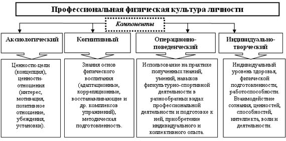 Рис. 2 Модель профессиональной физической культуры Рассмотренная модель позволяет сформулировать задачи физического воспитания: 1) образовательные - формирование средствами физического воспитания прикладных знаний, умений и привычек; профессиональной физической культуры личности (ценностное отношение, знание и привычки с ППФП); готовности к профессиональной физической самоподготовке; 2) воспитательные - формирование интереса, стойкой мотивации к занятиям, воспитание профессионально важных физических, психических, личностных и эмоционально-волевых качеств; 3) развивающие - развитие психофизической подготовленности, высокого уровня трудоспособности; 4) оздоровительные - формирование необходимого уровня здоровья, которое обеспечит высокую трудоспособность и надежность в профессиональной деятельности; 5) культурологические - формирование ценностей и культурных привычек. Для реализации выделенных задач в содержание физического воспитания необходимо ввести кроме операционно-поведенческого, еще и когнитивный, аксиологический, и индивидуально-творческий компоненты. Это обусловлено и тем, что на предприятиях полностью уничтоженные занятия физическими упражнениями и каждый специалист должен самостоятельно заботиться за свою трудоспособность и здоровье. При этом, за последние десятилетия производство благодаря высоким темпам научно-технического прогресса и компьютеризации, полностью изменило характер и условия работы студентов высших технических учебных заведений - большинство инженерных профессий механизированная, возрастает процент умственной, малоподвижной работы. Созданные "комфортные" условия работы приводят к "мышечному голоду", а это приводит к уменьшению энергетического потенциала, снижение трудоспособности и стойкости к заболеваниям. При этом повышается эмоциональное и нервное напряжения, увеличивается нагрузка на органы зрения, повышаются требования к трудоспособности и надежности специалиста. Все это нуждается в учете и корректировании всей системы физического воспитания в направлении формирования у специалистов "умственных, малоподвижных профессий" ценностного отношения к физическим воспитанию, мотивацию к самостоятельным комплексам физических упражнений с компенсаторной, профилактической и оздоровительной направленностью, культурную привычку делать производственную зарядку [1]. Для того чтобы содержание дисциплины "физическое воспитание" соответствовало своему культурологическому содержанию, оно должно быть построено как система, в которой можно для формирования каждого компонента выделить свои элементы. Так для аксиологического и когнитивного - основные термины и понятия физической культуры; научные факты, объясняющие закономерности функционирования физической культуры общества и личности, позволяющие сформировать убеждения; основные законы, положения, принципы, раскрывающие сущность явлений в физической культуре, объективные и субъективные связи между ними; теории, объяснения явлений, происходящих в физической культуре как социальном феномене, и определяющих личностное развитие; знание об объекте и предмете физической культуры, методах ее познания, истории развития; средства творческого использования полученных знаний, умений, навыков, в разнообразных видах профе