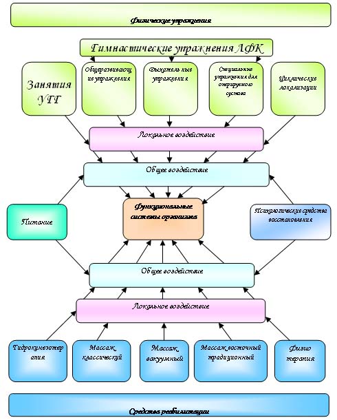 У наших пациентов показаниями к подводному массажу были кифосколиотические деформации позвоночника, посттравматические ограничения движений в коленном суставе пораженной конечности, трофические изменения в мышцах и периартикулярных тканях, снижение тонуса мышц конечностей. Современные концепции саногенеза признают резонансное восприятие живой системой-организмом человека информационных сигналов. При раздражении рецепторов кожи пациентов различными приемами массажных движений, особенно в области рефлексогенных зон Захарьина-Геда, биологически активных точек, происходят изменения локальных обменных процессов со стимуляцией неспецифических защитных сил организма и развитием адаптационных реакций. В курс предоперационной реабилитации мы включили комбинацию классического европейского, вакуумного и традиционного восточного массажа, которая помогла подготовить функциональные системы организма пациентов к оперативному вмешательству. Задачи массажа: улучшить крово - и лимфообращение в пораженном суставе; снять напряжение в мышцах конечностей; улучшить их трофику, тонус и силу; способствовать восстановлению нормальной амплитуды движения в суставах; способствовать рассасыванию экссудата в суставах и уменьшению боли и скованности; содействовать оздоровлению и укреплению всего организма. Вакуумный массаж применялся нами в сочетании с классическим. Количество сеансов, время и силу воздействия мы регулировали в соответствии с состоянием пациентов. Вначале проводился классический массаж со всеми его основными приемами: поглаживанием, растиранием, разминанием и вибрацией. После этого мы приступали непосредственно к вакуумному массажу, проводимого аппаратом "МВТ-01". При проведении восточного массажа мы использовали пальцевую акупрессуру. При признаках, характеризующих повышенную чувствительность, проводилось более слабое раздражение и наоборот. Зависимость жизнедеятельности организма от условий внешней среды и непосредственно от влияния составляющих ее физических факторов, дает право рассматривать физические факторы, как наиболее физиологичные раздражители для организма, в связи с чем, целенаправленно использовать их для получения обратных реакций организма с целью уменьшения или ликвидации патологических процессов. Физические факторы действуют на различных уровнях интеграции организма, оказывая рефлекторное, гуморальное, физико-химическое воздействие на ткани организма. Специфичность влияния физических агентов определяется видом физической энергии, глубиной проникновения ее в ткани, уровнем и местом поглощения энергии, локализацией воздействия, видом ткани, на которую оказывается влияние, что позволило нам дополнить разработанный курс рядом физиотерапевтических процедур. Среди других факторов поддержания и укрепления здоровья пациентов питанию принадлежит исключительная роль, в связи с его фундаментальным глубинным воздействием на все биохимические и физиологические процессы организма. Повышенные физической нагрузки, нервно-эмоциональное напряжение, многолетнее нарушение режима питания неизбежно приводят к патологическим изменениям жизненно важных функций. Поэтому питание пациента на этапах медицинской реабилитации имеет большое значение, что также нашло отражение в разр