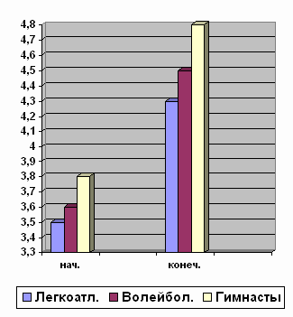 Из вышеприведенных данных мы можем сделать вывод о том, что самый высокий положительный прирост показали студенты, специализирующиеся в гимнастике и легкой атлетике. На основании этого можно сказать, что занятия гимнастикой и легкой атлетикой позволяет наилучшим образом развивать основные двигательные способности и достигать высокого уровня общей физической подготовленности. В результате проведения начального тестирования по специальной физической подготовке контрольной и экспериментальной групп мы получили следующие данные. Средний бал подготовленности гимнаста составил 3.8 балла, волейболистов - 3.6 балла, а легкоатлетов - 3.5 балла. В результате конечного тестирования уровень специальной физической подготовки контрольной группы у гимнастов составил в среднем - 4,7 балла, у волейболистов - 4.4 балла, у легкоатлетов 4.2 балла, а экспериментальной группы у гимнастов составил в среднем - 4,8 балла, у волейболистов - 4.5 балла, у легкоатлетов 4.3 балла. Из вышеперечисленного следует, что динамика прироста контрольной группы у гимнастов составила 0.9 балла, у волейболистов 0,8 баллов и у легкоатлетов 0,7 баллов, а экспериментальной группы у гимнастов составила 1 балла, у волейболистов 0,9 баллов и у легкоатлетов 0,8. баллов (таблица 2). Таблица 2 Результаты тестирования по специальной физической подготовленности контрольной и экспериментальной групп