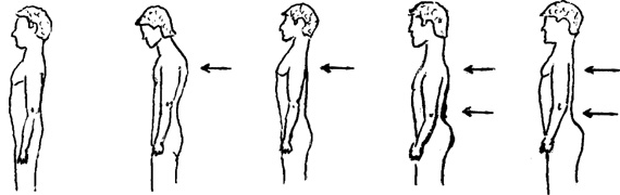 Правило так называемого перекрестного чередования активности основных мышечных групп предполагает выполнение упражнений, когда в работу последователь но включаются относительно автономные мышечные группы. Степень автономности мышечных групп характеризуется силой корреляционных связей между ними (положительной или отрицательной, сильной, средней и слабой). Рис. 1 Формы спины: 1 -