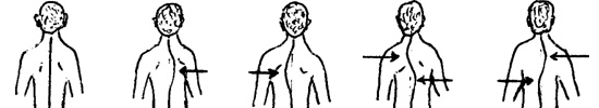 Рис. 2 Формы скозлиозов: 1 - нормальная спина, 2 - правосторонний, 3 - левосторонний, 4 и 5 - S-образный (слева направо)