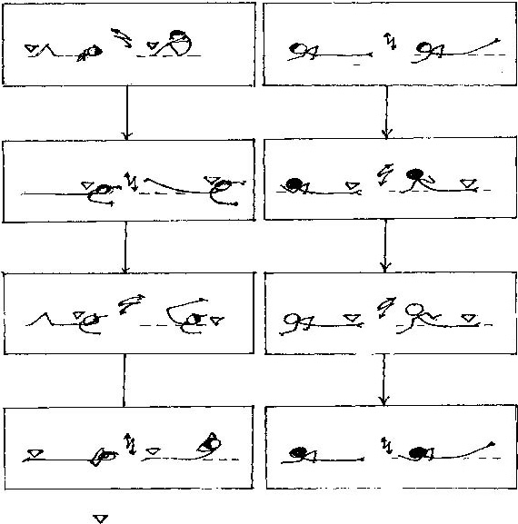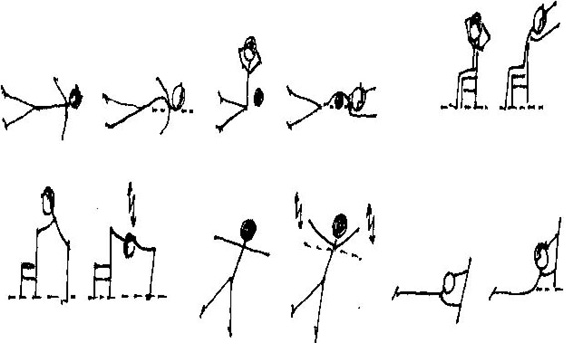 Рис. 3 Постановка стоп по линии передвижения Этот признак может быть главным в определении задач, содержания и структуры занятий с различной направленностью: оздоровительной, профилактической или корригирующей. Для коррекции круглой спины (рис. 1, 2) следует растянуть мышцы передней поверхности и укрепить (повысить тонус) мышцы задней поверхности туловища. Проработка мышц верхней и нижней зон грудной части позвоночника осуществляется посредством корригирующих упражнений в комфортном положении для позвоночника: в положении лежа, висе, седе [14]. За оcнову принимается структура комплекса упражнений для лиц с нормальной осанкой. Но в его состав могут включаться корригирующие упражнения. Примерные упражнения представлены в табл. 2. Таблица 2. Корригирующие упражнения для круглой спины