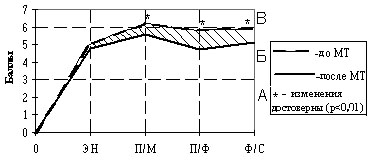 Рис.2. Изменение показателей функционального состояния организма спортсменов под влиянием МТ: ЭН - энергетика, ПМ - психомоторика, ПФ - психофизиология, ФС - функциональное состояние организма,
