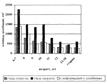 Рис. 1. Возрастная динамика показателя поля колебаний о.ц.м. тела Установлена корреляционная взаимосвязь тестов с открытыми, закрытыми глазами и со зрительным контролем устойчивости тела г = 0,614-0,840. Это позволило рекомендовать в качестве контроля за статодинамической устойчивостью один из тестов - с открытыми глазами. Учитывая левостороннюю асимметрию, обнаруженную при изучении характера статистического распределения у обследованных гимнастов, сочли возможным рассчитать прогрессирующую шкалу, где результаты в тестах оцениваются по-разному. Чем выше устойчивость о.ц.м. тела спортсмена, тем относительно большее количество баллов он получает. На втором этапе исследований изучался характер реакций организма гимнастов на дозированную вращательную нагрузку. Вполне естественно, что после нагрузки показатели равновесия тела у всех спортсменов ухудшались (табл. 1). Общий размах колебаний о.ц.м. тела после нагрузки у обследованных гимнастов составлял в объективных единицах измерения широкий диапазон - от 500 до 9500 мм2. Таблица 1. Показатели статодинамической устойчивости тела гимнастов (n=8) в покое и после вращательной нагрузки (мм2 поля колебаний о.ц.м. тела)