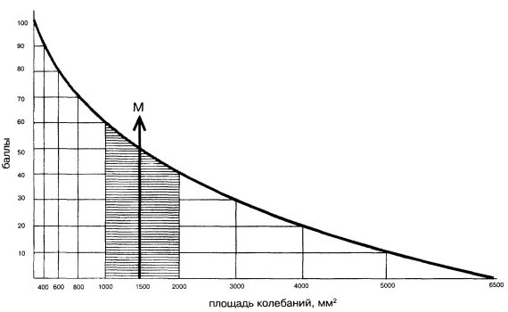 Рис. 2. Шкала оценки устойчивости тела гимнастов после вращения вокруг своей оси Данное обстоятельство свидетельствует о том, что ста-тодинамическая устойчивость тела регулируется физиологическими механизмами, состояние которых во многом обусловлено наследственными факторами и в меньшей степени развивается в процессе тренировки. Если это так, то соответствующие показатели целесообразно использовать в процессе отбора гимнастов на начальном этапе подготовки в комплексе с другими широко используемыми в этих целях тестами. Результаты исследования дают возможность рекомендовать шкалу для оценки статодинамической устойчивости тела гимнастов после вращательной нагрузки в объективных единицах измерения площади колебаний о.ц.м. тела и в системе баллов (рис. 2). Это позволит использовать рекомендуемый тест в общей батарее специфических тестов специальной физической подготовленности гимнастов Литература 1. Болобан В.Н. Система обучения движениям в сложных условиях поддержания статодинамической устойчивости: Автореф. докт. дне. Киев, 1990. -43 с. 2. Бретз К. Устойчивость равновесия тела человека: Автореф. докт. дис. Киев, 1997. - 42 с. 3. Зациорский В.М. Физические качества спортсмена (основы теории и методики воспитания). - М.: ФиС, 1970. 4. Зациорский В.М. Основы спортивной метрологии. - М.: ФиС, 1979. - 152 с. 5. Коханович К. Совершенствование спортивно-технической подготовки гимнастов 7-8-летнего возраста путем целенаправленного развития ловкости: Канд. дис. - Л., 1981. - 167 с. 6. Коц Я.М. Организация произвольного движения. - М.: Наука, 1975. 7. Лукьяненко В.П. Точность движений: проблемные аспекты теории и их прикладное значение. // Теория и практика физической культуры, 1991, № 4. 8. Фарфель В.С. Управление движениями в спорте.-М.: ФиС, 1975. 9. Чхаидзе Л.В. Об управлении движениями человека. - М.: ФиС, 1970. 10. Совершенствование технического мастерства спортсменов /Под ред. В.М. Дьячкова. - М.: ФиС, 1972. - 231 с. 11. Спортивная гимнастика (юноши). Программа для детско-юношеских спортивных школ, специализированных детско-юношеских школ олимпийского резерва и школ высшего спортивного мастерства. - М.: Комитет по ФК и спорту при Совмине СССР, 1983.-144 с. 12. Юный гимнаст /Под ред. проф. А.М. Шлемина. - М.: ФиС, 1973. - 375 с.
