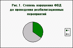 Результаты работы и их обсуждение. Средние значения параметров форсированного выдоха до и после реабилитационных мероприятий, а также их сравнение приведены в табл. 2. Как видно из табл. 2, у детей, больных БА, в процессе реабилитационных мероприятий наблюдалось улучшение основных параметров, характеризующих ФВД. Наиболее значительно (в среднем на 47%) увеличился МОС 75. Повышение этого показателя в ходе реабилитации представляется наиболее ценным, т.к. именно он характеризует состояние бронхов мелкого калибра, которые являются главным объектом поражения при БА. Сведения о том, как изменилась степень нарушения ФВД у наблюдаемых детей, приведены на рис. 1 и 2. Таблица 2. Изменение средних значений параметров ФВД у детей, больных БА, в процессе реабилитационных мероприятий