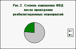 1 - значительное нарушение ФВД (8 человек), 2- умеренное нарушение ФВД (17 человек) 1- показатели ФВД в пределах нормы (19 человек), 2- умеренное нарушение ФВД (6 человек) Выводы. Разработанная нами комплексная система реабилитации детей младшего школьного возраста с БА обеспечила клиническое улучшение состояния больных: ремиссия была достигнута у 19 больных в срок до 2 месяцев, у 6 больных приступы стали носить эпизодический характер и протекать в более сглаженной форме. У всех пациентов наблюдалось улучшение показателей ФВД: ОВФ 1 возрос в среднем на 13 %, МОС 25 - на 25 %, МОС 50 - на 31%. Значительно улучшилась проходимость бронхов мелкого калибра, о чем свидетельствует повышение МОС 75 на 47 %