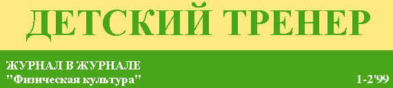 ТРЕНЕР Читайте в НОМЕРЕ: - О том, что такое тренажеры и "с чем их едят" - Как решить: допускать до занятий спортом или нет? - О том, как разнятся показатели физического - развития гандболистов в зависимости от их игровых амплуа - Исследования в области психологии тренера - Фоторепортаж со СПОРТЛЭНДа'99 |