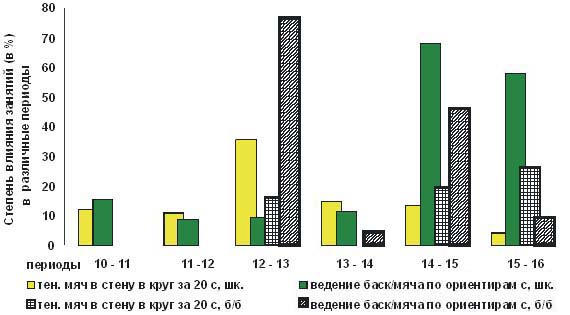 Тесты 1 и 2 позволяли исследовать сочетание быстроты и целевой точности. Наши исследования с помощью перечисленных тестов проводились на одних и тех же группах юных спортсменов дважды в течение года. Это было необходимо для прослеживания динамики изменения исследуемых качеств и навыков под воздействием регулярных тренировок в ДЮСШ. Тестирующие исследования школьников также проводились с годовым перерывом. Результаты и обсуждение. На рисунке представлена степень влияния обучения и тренировки в различные возрастные периоды на развитие быстроты и целевой точности (в сочетании) у школьников 10 - 16 лет и юных баскетболистов 12 - 16 лет. Так, в метаниях в стену теннисного мяча в круг за 20 с у юных баскетболистов на протяжении всего исследуемого периода степень влияния тренировки незначительна. Относительно ведения баскетбольного мяча по ориентирам на максимальной скорости с изменением требований к целевой точности можно сказать следующее: в период 12 - 13 лет степень влияния тренировки максимальна, в период 14 - 15 лет она также высока, а в остальные периоды - практически незначима. У школьников степень влияния обучения в метаниях в стену теннисного мяча в круг за 20 с в период 12 - 13 лет хотя и максимальна, но все же невысока, в остальные же периоды она практически незначима. В тесте ведения баскетбольного мяча по ориентирам на максимальной скорости в период 14 - 15 лет степень влияния обучения максимальна, в период 15 - 16 лет она также очень высока, в остальные же периоды - практически незначима. Таким образом, у юных баскетболистов в тесте ведения баскетбольного мяча на максимальной скорости при изменении требований к целевой точности выделяют период 12 - 13 лет (max) и период 14 - 15 лет, когда степень влияния тренировки также высока. У школьников в этом же тесте можно выделить периоды 14 - 15 лет (max) и 15 - 16 лет.