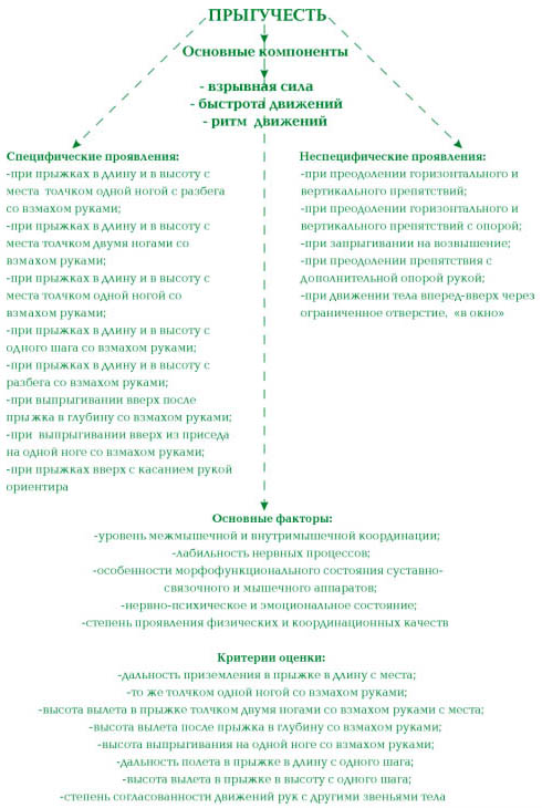 необходимое условие для раз Развитие прыгучести в значительной мере определяется координационными качествами , в частности ловкостью . Овладение ритмом разбега, толчка, а также движениями в безопорной фазе требует высоких показателей ловкости. Хорошая гибкость позвоночника позволяет прыгунам эффективно выполнять движения телом в фазе полета (в длину и высоту). Необходимая амплитуда движений различных звеньев тела - также важное условие успешного выполнения прыжка. Уровень развития ритмичности влияет на достижение согласованности движений в любой фазе прыжковых упражнений. Сохранение равновесия во время разбега, и особенно в безопорной фазе, также существенно влияет на результат спортсмена. При выполнении прыжка в длину атлет дополнительными движениями тела, нижних и верхних конечностей удлиняет фазу полета и способствует достижению устойчивости равновесия в безопорной фазе. Таким образом, прыгучесть имеет свои структурные особенности, компоненты, зависит от ряда факторов, тесно взаимосвязана с двигательно-координационными качествами, что необходимо учитывать в учебно-трениро вочном процессе. У прыгучести, как и у других двигательно -координационных качеств, множество проявлений, которые условно можно представить в виде специфических и неспецифических (см. схему). Высота и дальность прыжка в значительной степени зависят от способности спортсмена к максимально быстрому развитию усилий. Движение руками создает начальный импульс, обеспечивающий определенную скорость движений, и способствует проявлению взрывной силы. Высота положения о.ц.т. тела прыгуна определяется в первую очередь оптимальным сочетанием вертикальной и горизонтальной скоростей вылета. Самая сложная фаза прыжка - переход от разбега к толчку. Эффективность действий спортсмена в данной фазе определяется также величиной совпадения момента завершения отталкивания с вертикальным положением тела над опорой. Итак, прыгучесть определяется целым рядом слагаемых, включая и оптимальный угол вылета и скорость маховых действий. Это предъявляет повышенные требования к ритму двигательных действий. Без достижения необходимой согласованности движений всех звеньев тела в каждой фазе прыжка, и особенно в момент отталкивания, его эффективное выполнение невозможно.