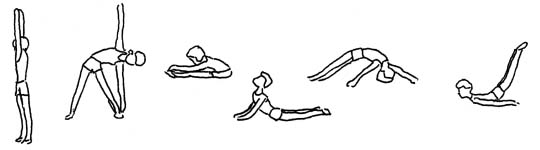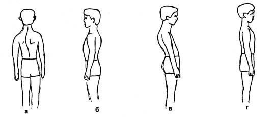 Рис. 1. Типичные виды нарушения осанки: а - сколиоз, б - лордоз, в - кифоз, г - правильная осанка Упражнения для формирования правильной осанки младшего школьника включают фиксацию стойки смирно и стойки смирно у стены (прислонясь к стене), прогибание туловища в основной стойке (прогибание туловища в положении выпада вперед, в наклоне назад) и в положении лежа (прогибание назад в положении лежа на животе, подъем прямых ног назад из того же положения), вращение туловищем влево и вправо, наклоны вперед и назад. Можно выполнять специальный комплекс упражнений из системы хатха-йога, подобранный для учащихся младшего школьного возраста (рис. 2). Правила выполнения физических упражнений для формирования осанки. Все упражнения выполняются без излишнего напряжения, задержек дыхания (за исключением специально оговоренных случаев). Необходимо исключить возникновение всех неприятных ощущений. Если же они возникают, это служит признаком либо неверного выполнения упражнения, либо неподготовленности школьника. Постепенно нужно увеличивать время выполнения упражнений и интенсивность нагрузки. Но чувства усталости не должно наступать: ведь эти упражнения не предназначены для тренировки физических качеств (силы, быстроты, выносливости, ловкости), а формируют правильное положение головы, туловища, рук и ног. Если при тренировке физических качеств основное правило - достижение утомления, то при формировании осанки оно будет только мешать поддержанию правильной позы. Для сохранения правильной осанки очень важно иметь тренированные мышцы живота. На этот раздел мы советуем обратить особое внимание. Для детей младшего школьного возраста полезны занятия разными видами физических упражнений на открытом воздухе. Летом это могут быть катание на велосипеде, купание в открытых водоемах, пешие прогулки по лесу или парку, игры в футбол, волейбол, бадминтон со сверстниками. Зимой, несомненно, прогулки на лыжах, катание на коньках. В ненастную погоду (в так называемые переходные периоды - осенью и весной), когда слякотно, промозгло и ветрено, можно энергично выполнять общеразвивающие упражнения. Примерный комплекс таких упражнений (которые можно выполнять безо всяких приспособлений и спортивного инвентаря) приведен на рис. 3. Способы контроля правильной осанки: обычно осанку проверяют в положении стоя у стены. Если затылок, лопатки, ягодицы и пятки касаются стены, то осанка может быть признана в основном правильной. Если обнаружится, что голова слишком наклонена вперед (затылок не касается стены), вся спина касается стены (плоская спина), ягодицы не касаются стены - имеются признаки нарушения осанки. В этом случае необходимо обратиться к детскому врачу и проверить свою осанку более тщательно. Врач поможет подобрать и индивидуальный комплекс упражнений, который требуется при разных видах нарушения осанки.