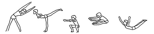 Рис. 3. Комплекс общеразвивающих упражнение для младшего школьника. Упражнения выполняются от 10 до 30 с. Между ними - период отдыха от 30 до 40 с. Казалось бы, о важности тренированного брюшного пресса для здоровья человека известно достаточно широко, однако наблюдения показывают, что у многих школьников этот недостаток выражен очень ярко. Полагаться только на "попутную" тренировку мышц живота при помощи "неспециализированных" упражнений нельзя. В этой ситуации помогут простые, не требующие специального оборудования, но чрезвычайно эффективные упражнения. Овладение этими упражнениями не требует длительной подготовки, а выполнение комплексов не занимает много времени. Все приведенные упражнения можно использовать для учащихся разных возрастов. Различия заключаются в дозировке тренировочной нагрузки. Упражнения выполняются на любой ровной чистой поверхности, не имеющей шероховатостей и трещин. И.п. - лежа на животе. Согнуть ноги в коленях, взяться руками за голени. Прогнуться назад, голову запрокинуть. Зафиксировать позу 20-30 с, дыхание свободное. Вернуться в и.п. И.п. - лежа на спине. Выполнить наклон вперед, головой коснуться коленей, руками обхватить лодыжки, зафиксировать позу в течение 60-90 с. Колени от пола не отрывать. Дыхание свободное. Вернуться в и.п. И.п. - лежа на спине. Приподнять туловище, не отрывая ног от пола, руки сложить на затылке, зафиксировать позу 10-20 с. Дыхание при выполнении позы свободное. Вернуться в и.п. И.п.- лежа на спине, руки подняты вверх. Не отрывая ноги от пола поднять туловище, одновременно поворачивая его в сторону. Зафиксировать позу 10-20 с и вернуться в и.п. Повторить в другую сторону. И.п. - лежа на спине. Поднять прямые ноги примерно на 30о, зафиксировать позу, поднять ноги на 60о, зафиксировать позу. Поднять ноги на 90о, зафиксировать позу, вернуться в и.п. Продолжитель ность фиксации позы в каждом положении одинакова и зависит от индивидуальной подготовленности. И.п. - основная стойка, ноги шире плеч, руки в стороны. Выполнить наклон до касания пальцами левой руки носка левой ноги. Правая рука вытянута вверх. Выдержать позу в течение 30 с, дыхание свободное. После этого выполнить упражнение с наклоном в другую (правую) сторону. И.п. - основная стойка. Выдохнуть, задержать дыхание. На задержке дыхания втянуть живот и затем сразу же расслабить мышцы живота. Чередовать втягивание и расслабление мышц живота в быстром темпе, не прекращая задержки дыхания. Расслабить мышцы и сделать глубокий вдох. По мере роста тренированности увеличивать количество циклов. Тренировка на укрепление мышц брюшного пресса не приводит к общему утомлению ребенка и учит управлять мышечными сокращениями. Освоив предложенные упражнения, школьники смогут выполнять их самостоятельно в виде домашних заданий или как средство разминки перед спортивной тренировкой. Не обязательно все предлагаемые упражнения включать в одно занятие. Можно чередовать их использование, комбинируя в разных сочетаниях. Между упражнени ями рекомендуется отдых в течение 30 с. Закончив комплекс, полезно расслабиться в положении лежа с закрытыми глазами в течение 1-1,5 мин. Рекомендуемая литература 1. Васильев Т.Э. Начала Хатха-Йоги. - М.: Прометей, 1990. - 232 с. 2. Верещагин В.Г. Физическая культура индийских йогов. - Минск: Полымя 1982. - 144 с. 3. Воронин В. Хатха-Йога: что мы можем взя