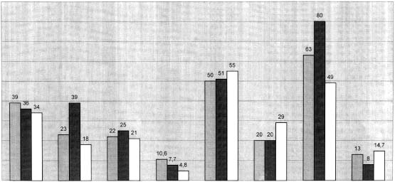 мл/кг. СР. Во время силовой части занятия испытуемые выполняли отжимания из упора лежа. При сгибании рук угол между плечом и предплечьем - 90°. Кисти - под плечами. Спина, ягодицы, ноги составляют прямую линию. СБП. Лежа на спине, руки верх, ноги поднять в вертикальное положение. Нижнюю часть спины плотно прижать к полу. Дышать равномерно. Тест выполняется в парах. Партнерша кладет одну руку под поясницу испытуемой, а другой касается поднятых ног. Тестируемая медленно опускает ноги на пол, стараясь при этом не отрывать поясницу от пола. Как только партнерша почувствует, что поясница не прижата к полу, она задерживает ноги испытуемой и измеряет расстояние между полом и пятками. Чем меньше расстояние между полом и пятками, тем лучше показатель силы нижнего отдела брюшного пресса. ГС. Испытуемые выполняли наклон вперед как можно ниже с платформы высотой 15 см. Результат регистрировался по линейке, прикрепленной одним концом к краю платформы, другим - к полу. Результаты исследования. Средние данные по трем группам представлены на рисунке. Шкала Спилберга позволяет определить УТ занимающихся. В экспериментальной группе он равен 34 баллам, по сравнению с двумя контрольными группами, где он составляет 39 и 36 баллов. Результаты ОО показывают, что в группе, занимающейся аэробикой, он достигает 23%. В группе, которая занимается степ-аэробикой, равен 39%. В группе, которая выполняет программу аэробики и степ-аэробики, - 18%. ЧСС в экспериментальной группе - 21 уд/мин, в контрольных группах - 22 и 25 уд/мин. Обсуждение результатов 1. В экспериментальной группе наблюдается тенденция к снижению уровня ситуативной тревожности, что говорит об улучшении психоэмоционального статуса занимающихся. 2. Отмечено снижение ОО в экспериментальной группе, что свидетельствует об экономизации работоспособности организма. 3. Отмечено снижение ЧСС в состоянии покоя в экспериментальной группе по сравнению с контрольными группами, что говорит о повышении уровня общей работоспособности. 4. Исследование показало более низкий результат ТР в третьей группе, что позволяет говорить о лучшей тренированности сердечно-сосудистой системы. 5. Лучший результат ЖП в экспериментальной группе по сравнению с контрольными группами указывает на улучшение функционирования дыхательной системы. 6. Результаты тестов на развитие силы рук, мышц нижнего отдела брюшного пресса, гибкости в третьей группе существенно выше, что свидетельствует об эффективности методики занятий в этой группе. Выводы. На основе результатов исследования можно говорить, что в экспериментальной группе по сравнению с контрольными более высокие показатели тренированности (общей физической работоспособности). Примененные методы комплексного контроля тренировочных занятий информативны, на их основе можно дать объективную оценку психофизиоло гическим изменениям в организме занимающихся. Другие использованные в работе методы тестирования не позволили на данном этапе исследования выявить различия в показателях занимающихся.