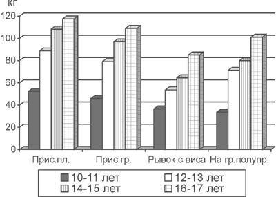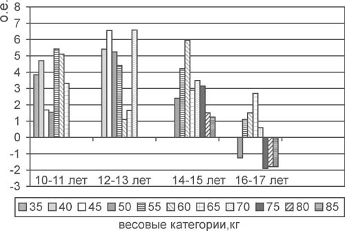 Прирост спортивных показателей в толчке на соревнованиях по сравнению с тренировочными результатами был заметно выражен у атлетов 14-15 и 16-17 лет, в меньшей степени - в возрастной группе 13-14-летних спортсменов. По сравнению с младшими по возрасту спортсменами большинсство 16-17-летних атлетов показывают на соревнованиях более низкие результаты в толчке (см. таблицу). Это видно и по показателям КИФВ, которые в этом упражнении у 10-11-летних тяжелоатлетов были равны 2,3; у 12-13-летних - 3,5; у 14-15-летних - 2,6 и у 16-17-летних - 1,7 о.е. Результаты анализа спортивных достижений тяжелоатлетов 10-17 лет показали, что их уровень постоянно растет по мере улучшения физической подготовленности спортсменов и в зависимости от их весовой категории, причем особенно заметно у тяжелоатлетов 10-11 и 12-13 лет. Характер изменения спортивных результатов на соревнованиях по отношению к тренировочным результатам во всех возрастных группах неодинаков. Более ровные спортивные достижения во всех весовых категориях были у тяжелоатлетов 12-13 и 14-15 лет. У них четко прослеживается связь между спортивными достижениями и весовыми категориями. Однако качественный показатель использования физических возможностей, который зависит от разности в спортивных результатах, показанных на тренировках и соревнованиях, был более высоким у юных тяжелоатлетов 12-13 лет. Наиболее низкий его уровень оказался у тяжелоатлетов 16-17 лет (рис.1).