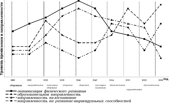 Рис. 1. Взаимосвязь между динамикой исторических процессов в России и уровнем проявления приоритетов в физическом воспитании (1889-2000 гг.) Первая Российская программа ФВ, созданная в 1889 г. по распоряжению министерства просвещения, была нацелена преимущественно на освоение воинских дисциплин [5]. Тем самым было узаконено активное воздействие на особенности прикладных свойств личности. Неслучаен здесь и ведущий принцип: "Все, как один". Это продолжалось до 1920 г. (см. рис. 1). В 1920 г. решения III съезда РКСМ провозгласили в качестве цели ФВ "Воспитание гармонически развитого человека, творца". В качестве практических целей рассматривались подготовка к трудовой деятельности и к вооруженной защите Отечества. Характерно, что школьные программы имели в то время "гигиенический уклон", содержание уроков было восстановительно-поддерживающей направленности . Граждане страны, в которой победила социалистическая революция, в качестве "идеального образа результата" (цели, согласно [15]) провозгласили гармоничное развитие личности. В это время основу содержания физических упражнений составляли естественные трудовые движения, впервые в программу были включены элементы спорта. Отметим, что в РФ в этот период стояло "под ружьем" 5 миллионов человек. Если последующие 12 лет в ФВ с определенным допуском можно характеризовать как "оздоровительные", с введением ГТО в 1932 г., а затем БГТО в 1934 г. физическая подготовка вышла на передовые позиции. Обращает на себя внимание требование "увязки ФК с военным делом", что в очередной раз склоняет чашу весов в сторону гипертрофии прикладных свойств личности, приоритета решения государственных задач [7]. Следует признать, что практически во все годы своего существования СССР находился во враждебном окружении. С этой точки зрения прикладная и оборонительная направленность программ ФВ выглядит совершенно логичной. Вместе с тем возможности для целенаправлен ного стимулирования развития индивидуальности и активности личности объективно становятся все меньшими. 1939 год, утвержден новый комплекс ГТО. Он еще несколько раз будет изменен в период до 1946 г. в связи с приближением его содержания к условиям военного времени. В 1946-1948 и в начале 50-х гг. школьные программы освобождаются от военной направленнос ти. Задачи ФВ были скорректированы с учетом выхода советских спортсменов на мировую арену. В воспитании культивируется приоритет исполнительности. В период 1954-1955 гг. и по 1970 г. физическое воспитание (при незыблемости цели) приобретает образовательную направленность. Гимнастика и легкая атлетика выделены в самостоятельные разделы. Это качественно новый этап как в педагогике, так и в развитии общества. Именно в этот период функционирования образовательной программы и в самом обществе мы видим максимальные достижения. 12 апреля 1961 г. Ю.А. Гагарин совершил беспримерный в истории человечества полет в космос. Это время называют временем "хрущевской оттепели". Приоритеты во взаимоотношениях между государством и личностью сдвинулись тогда по направлению к личности. В 1970-1991 гг. сложные элементы спорта постепенно исключаются из школьных программ. Оздоровительная направленность становится ведущим фактором. Усилена кроссовая подготовка. Характерно, что период с 1966 по 1970 г., период 8-й пятилетки, совпавшей с началом реформ, оказалс