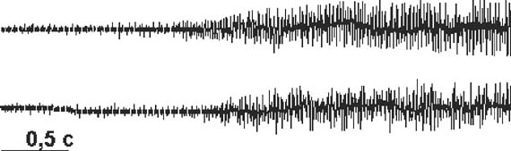 Рис. 1. Регистрация ЭМГ мышц спины с правой (верхняя запись) и левой (нижняя запись) половины туловища при одновременном вызове ТВР мышц у обследуемого С-ва Эти различия достигали достоверно значимого уровня (р<0,05), что указывает на более высокую возбудимость двигательных центров на одной из половин туловища. Результаты проведенных исследований позволяют предположить, что дисбаланс рефлекторной возбудимости нервных двигательных центров по разные стороны позвоночного столба приводит к асимметрии мышечного тонуса на правой и левой половине туловища в области поясничного отдела, которые в последующем могут привести к сколиотической аномалии осанки у детей С целью проверки указанного предположения был проведен педагогический эксперимент. С детьми, отнесенными к контрольной группе, не проводились занятия профилактической направленности на коррекцию осанки. В экспериментальных группах в течение учебного года три раза в неделю проводились профилактические занятия с использованием симметричных и асимметричных корригирующих упражнений. К симметричным корригирующим упражнениями относятся гимнастические упражнения, при которых сохраняется срединное положение линии остистых отростков. Асимметричные корригирующие упражнения позволяют подобрать исходное положение и мышечную тягу соответствующих мышц конкретно на данный участок позвоночника [11]. В нашем случае акцент делался на мышечных группах поясничного отдела позвоночного столба. 85% от общего объема физической нагрузки приходилось на симметричные корригирующие упражнения, 15% - на асимметричные. В первой экспериментальной группе интенсивность выполнения упражнений была одинакова для всех и стандартизировалась командой педагога. Во второй экспериментальной группе при определении интенсивности выполнения упражнений учитывались врожденные задатки детей к выполнению скоростной работы и работы на выносливость. Количество повторений и интервал отдыха между сериями упражнений зависели от функциональных возможностей занимающихся, интенсивности работы и регулировались частотой сердечных сокращений (ЧСС). Восстановление ЧСС до 100-110 уд/мин свидетельствовало о готовности занимающихся к выполнению следующей серии упражнений корригирующей направленности. При выполнении физических упражнений сердечный пульс находился в диапазоне 125-170 уд/мин. При необходимости, с целью улучшения контроля над срединным положением позвоночника, остистые отростки отмечали раствором йода, а одежда на занятиях позволяла оставлять спину открытой.