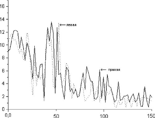Рис. 2. Графическая запись частотных характеристик ЭМГ поясничного отдела мышц спины с использованием анализа Фурье у обследуемого С-ва с правой и левой половин туловища Обнаруженная асимметрия развития ТВР в мышцах спины не была проявлением только локального феномена, связанного с изменением функционального состояния данной конкретной мышцы. Так как мышцы спины участвуют в поддержании вертикальной стойки, вполне логичным было предположение о возможном изменении системы регуляции постуральных механизмов. Это предположение проверялось в исследованиях по изучению рефлекторной активности мотонейронов мышц голени, обеспечивающих поддержание вертикальной стойки. С этой целью были изучены характеристики рефлекторной возбудимости мотонейронов икроножной мышцы левой и правой ноги при вызове Н - и Т- рефлексов. Выраженность амплитудных (вольтажных) характеристик указанных рефлексов свидетельствовала о возбудимости мотонейронных ядер, которые находятся под влиянием нисходящих структур, сегментарных рефлекторных путей и сигналов от проприорецепторов [18, 10, 5, 6]. Сравнительный анализ рефлексов, возникающих в левой и правой ноге при одинаковых параметрах стимулирующих воздействий, выявил их существенные различия. Оказалось, что на той стороне туловища, где ТВР был повышен, соответственно была повышена амплитуда Н- и Т-рефлексов. Результаты проведенных исследований представлены на рис. 3.