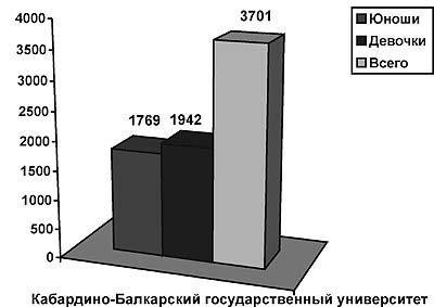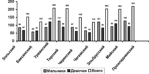 Х.М. Беребекова, Ключевые слова: мониторинг физического развития, природно-климатические условия, дети, подростки, молодежь. На современном этапе развития образования остановить регресс, стабилизировать, а затем улучшить ситуацию по оздоровлению учащейся молодежи Кабардино-Балкарской Республики поможет переход от авторитарных, групповых подходов в физическом воспитании к личностно ориентированным методам обучения и воспитания, базирующимся на индивидуальных возможностях и способностях детей. Основой этой прогрессивной технологии может стать Единая система мониторинга физической подготовленности детей и учащейся молодежи с учетом природно-климатических условий КБР. Система предполагает создание районных аналитических Центров по регулярному (не реже двух раз в год) сбору информации для оперативной диагностики и коррекции физической подготовленности контингента на основе "Тест-программы" с констатацией факторов, влияющих на физическое здоровье подрастающего поколения, объективную оценку ситуации и принятие конкретных мер, обеспечивающих коррекцию здоровья от конкретного человека до населения республики в целом. Для реализации целей Всероссийского мониторинга на базе Кабардино-Балкарского филиала ВНИИФКиС была создана Центральная служба мониторинга по обработке, хранению и рациональному использованию глобальной информации о физическом состоянии и здоровье детей и учащихся городов и районов с учетом природно-климатических и экологических условий КБР. Это дало возможность прослеживать ситуацию как в целом по Кабардино-Балкарской Республике, так и по каждому отдельному образовательному учреждению и влиять на нее путем оптимизации содержания программного обеспечения по физической подготовке детей и учащихся. Центральной службой мониторинга за 2002 г. было протестировано 3408 человек, (рис. 1, 2), что составило 0,45% от всего населения Кабардино -Балкарской Республики. Для анализа состояния физической подготовленности и физического развития дошкольников и учащихся использованы батарея из четырех двигательных тестов и данные физического развития (длина тела, масса тела, окружность грудной клетки на паузе). В ДОУ: бег на 30, 90, 120, 150 м, подъем туловища в сед за 30 с и прыжок в длину с места. В школах и вузах использовали: бег на 30 м, 500-1000 м, подтягивание на перекладине (мальчики), подъем туловища за 30 и 60 с, прыжок в длину с места.
