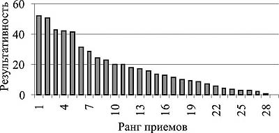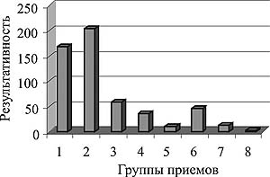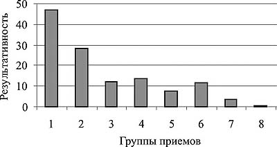 Для выявления тенденций последовательности освоения атакующих действий дзюдоистами младшего возраста (10-13 лет) проанализированы поединки старших юношей (до 17 лет) - участников Первенства России 2001 года и определены различия в результативности техники выполнения атакующих действий старшими юношами с показателями результативности всей школы техники дзюдоистов (юниоров, молодежи, взрослых). Старшие юноши лучше всего выполняют атакующие действия группы бросков TE-WAZA (броски с акцентирующими действиями руками), а все остальные дзюдоисты (юниоры, молодежь и взрослые) - броски из группы ASHI-WAZA (с акцентирующими действиями ногами) (рис. 1, 2, табл. 1).