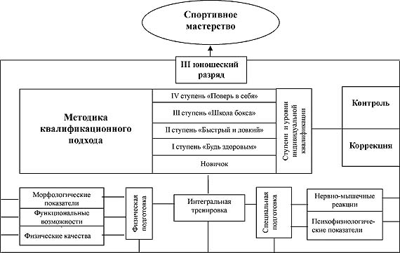Модель подготовки спортсменов-единоборцев, реализующая квалификационный подход (на примере методических подходов здоровьесбережения у боксеров-новичков) Вышеназванные блоки определяют содержание подготовки юного спортсмена (физической, специальной и интегральной) и являются первым уровнем предложенной модели. Следующий уровень модели - разработанная нами методика квалификационного подхода, предусматривающая поэтапную подготовку с постепенно возрастающими требованиями к занимающимся и учитывающая уровень их подготовленности. Занимающиеся делятся на три группы: оздоровительную, щадящую и сберегающую - по степени функциональной готовности сосудов мозга к физическим нагрузкам, где индивидуально подбираются различные по степени сложности упражнения. Технические элементы разучиваются постепенно: сначала для верхних конечностей, а потом с для нижних, что обусловлено большей функциональной трудностью для организма выполнения движений ногами, чем руками. При нормировании нагрузки необходима постепенная адаптация сосудистой системы головного мозга к интенсивным упражнениям, повышающим ЧСС до 200 уд/мин и выше. На начальном этапе необходима специальная тренировка на уровне ЧСС не более 130-150 уд/мин для повышения уровня функциональных возможностей сосудов головного мозга спортсменов -новичков. При этом исключается большой объем скоростных и интенсивных упражнений. Методика занятий предусматривает использование, например в боксе, мишеней, представляющих собой зашитые в мешочки резиновые мячи, закрепленные на груди спортсмена. Такой методический подход позволяет обеспечивать профилактику травматизма и постепенную адаптацию к механическим воздействиям, связанным с ударами. Такие мишени могут быть использованы также в кикбоксинге и каратэ. Методика квалификационного подхода включает четыре ступени: I ступень - "Будь здоровым", II ступень - "Быстрый и ловкий", III ступень - "Школа бокса", IV ступень - "Поверь в себя". Каждая ступень состоит из трех основных разделов: "Знания"; "Умения и навыки"; "Виды испытаний и нормы". В связи с этим необходимо отметить, что развитие физических качеств с помощью движений в значительной степени касается и развития умственных способностей ребенка (с развитием познаний о предметах и явлениях). Поэтому умственное развитие и двигательное развитие - это два связанных процесса [20]. Раздел "Знания" включает в себя следующие темы: история развития бокса; краткие сведения о строении и функциях детского организма, влияние на него занятий физической культурой и спортом; личная и общественная гигиена; профилактика травм и заболеваний, самоконтроль. Раздел "Умения и навыки" предусматривает овладение основами применения различных средств физической культуры и элементов спорта, а также умение применять гигиенические и закаливающие процедуры, средства самоконтроля за состоянием тренированности и другое; умение выполнять основные технико-тактические действия на различных дистанциях с разными по манере ведения поединка боксерами. Раздел "Виды испытаний и нормы" состоит из контрольных тестов, позволяющих определить разносторонний уровень квалификационных характеристик юного боксера. С помощью предложенных нормативов оценивается уровень подготовленности юного спортсмена и он переводится на друг