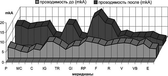 Изменения в энергетических меридианах школьников (n=60) под влиянием положительных эмоций Процесс тренировки в верховой езде (n=12) на кортах сочинской фирмы "Кентавр" ("Анимотерапия"), приводит к значительному увеличению проводимости по всем меридианам, а также к существенному выравниванию асимметрии проводимости правой и левой части каждого меридиана (р<0,01-0,001). По мнению некоторых зарубежных авторов [14], верховая езда приводит к мощному массажу позвоночного столба, воздействуя практически на все нервные окончания и стимулируя большинство органов. При занятиях горными лыжами (n=12) на курорте Красная Поляна отмечается достоверное (р<0,01) перераспределение проводимости БАТ из нижних меридианов F, RP, E, R в меридианы P, C, IG, GI [16, 17, 24 - 26]. После 15-минутного пребывания в пирамиде и употребления 200 г воды, простоявшей там двое суток (пирамидотерапия), при обследовании анализатором иммунодефицита "Хелпер" (Е.С. Степанов с соавт., 2000) зарегистрировано достоверное (р<0,05) повышение иммунитета у 69,2% испытуемых (n=26) [5, 10, 19]. Вырисовывается громадное, интересное направление в рекреации и медицине [11, 14], которое будет развиваться и расширяться на протяжении XXI века. В то же время практическая апробация отдельных элементов "Игрового лечения" в процессе исследований "Море-пляж-96" показала серьезные проблемы философского, методологического и психологического характера при контактах с медицинским персоналом, получившим традиционное медицинское образование; негативные явления экономического характера; а также факты низкой профессиональной подготовленности инструкторов в области рекреации даже на тех пляжах, где клиенты готовы платить за услуги. Литература 1. Агаджанян Н.А. Здоровье и перспективы цивилизации в XXI столетии //Тр. IV междунар. конф. "Современные технологии восстановительной медицины". Сочи, 2000, с. 2-7. 2. Волкова-Бабешко Л.Л., Томилин К.Г. К вопросу нетрадиционных методов оздоровления женщин 35-55 лет на курорте // Матер. I Междунар. молод. научно-практ. конф. "Проблемы и перспективы устойчивого развития туристско-рекреационного комплекса стран Черноморского бассейна. Повестка дня на XXI век". Т. I. Сочи, 2000, с. 90-92. 3. Кабак Г.В., Томилин К.Г., Буровых А.Н. и др. Разработка комплекса рекреационных услуг санатория "Ставрополье" с использованием традиционной народной медицины //Научно-практические аспекты народной медицины /По матер. Междунар. конгресса "Народная медицина России - прошлое, настоящее, будущее"/. Т. II. М.: ВНИЦТНМ "Эниом", 1996, с. 99-100. 4. Казначеев В.П., Баевский Р.М., Берсенева А.П. Донозологическая диагностика в практике массовых обследований населения. - Л.: Медицина, 1980. - 208 с. 5. Кислицын А.Н. Исследование питьевой воды, обработанной в пирамиде //Матер. Всероссийской научно-практ. конф. "Необычные эффекты пирамидальных структур". - Сочи: РИЦ СГУТ и КД, 1999, с. 15-16. 6. Мазур В.В., Марченко А.Ю., Пономарева Е.С. и др. К вопросу обоснования инноваций в социокультурной и оздоровительной сферах // Матер. III Междунар. научно-метод. конф. "Проектирование инновационных процессов в социокультурной и образовательной сферах". Сочи, 2000, с. 203-204. 7. Мазур В.В., Томилин К.Г. Водные виды рекреации в условиях Черноморского курорта // Тез. докл. научно-метод. конф. "Физическое воспитание в высшей школе". Краснодар, 1995, с. 99-100. 8. Мазур В.В., Томилин К.Г. Коррекция отклонений состояния здоровья студенч