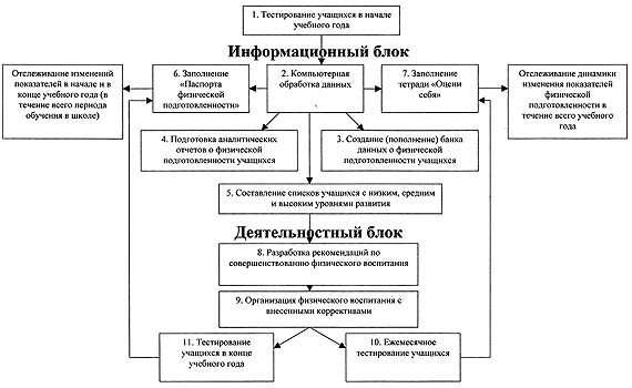 ориентированного подхода в том контексте, что Модель технологии проведения мониторинга состояния физической подготовленности в общеобразовательных учреждениях приведена на рисунке и включает два взаимосвязанных блока: информационный и деятельностный. Информационный блок, в свою очередь, включает ряд поэтапных операций: компьютерную обработку результатов тестирования, создание (пополнение) банка данных о физической подготовленности и другие (см. рисунок). Деятельностный же блок включает действия, осуществляемые на основе полученной в результате обработки информации: разработку рекомендаций для проведения занятий, организацию занятий, регулярное проведение тестирования. Проведение мониторинга состояния физической подготовленности учащихся в образовательных учреждениях в соответствии с предлагаемой моделью осуществляется следующим образом. Ежегодно в начале учебного года в образовательном учреждении (школе, колледже и т.п.) педагогом по физической культуре проводится тестирование учащихся основной медицинской группы (и подготовительной - по непротивопоказанным тестовым методикам). Затем полученные в результате тестирования показатели подлежат компьютерной обработке, которую в образовательном учреждении проводит один из задействованных для этого преподавателей информатики или лаборант кабинета информатики. Возможен также вариант внесения и обработки данных физической подготовленности самими учащимися (своего класса, например). Это основной информационный этап технологии, поскольку результаты компьютерной обработки являются базовыми для ряда последующих этапов. На основе полученного материала создается банк данных о физической подготовленности каждого учащегося, который по мере повторных тестирований пополняется новыми данными, отражающими изменения показателей физической подготовленности. Кроме того, обработанные результаты, представляемые в табличной и графической формах, являются основанием для подготовки аналитических отчетов о состоянии физической подготовленности учащихся на "бумажном носителе". Такого рода отчет включает информацию: - о состоянии физической подготовленности учащихся в целом в образовательном учреждении; - о результатах тестирования каждой параллели классов; - о результатах тестирования каждого класса; - о результатах работы отдельных педагогов по физической культуре; - рекомендации по совершенствованию постановки физического воспитания. Информация, представляемая, как указывалось, в табличной и графической формах, простых для восприятия, является полезной прежде всего для директора образовательного учреждения и педагогов по физической культуре. Директор, затрачивая минимум времени, получает информацию о состоянии физической подготовленности в целом по школе и, что важно, о качестве работы каждого педагога. Педагоги же получают общую картину развития отдельных физических качеств по классам, с которыми занимаются. Понятно, что для тех и других получаемая таким образом информация cлужит основанием для принятия приемлемых для данногоуровня управленческих решений. Далее, что чрезвычайно важно, в результате компьютерной обработки программа "выдает" списки учащихся, во-первых, не выполняющих нормативные требования по каждому кондиционному физическому кач