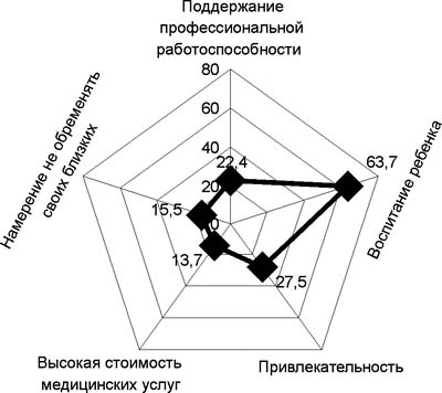Рис. 1. Ведущие мотивы поддержания здоровья Наряду с этим установлено, что 58,6% родителей осознают свою ответственность за здоровье ребенка, подчеркивая при этом, что забота о здоровье - важный показатель культуры человека. Большинство родителей (74,3%) понимают важность физической культуры в укреплении собственного здоровья, отмечая эффективность ее воздействия на организм. Однако занимаются физической культурой в настоящее время лишь 12% опрошенных, подтверждая тем самым тенденцию к снижению с возрастом объема двигательной активности. Примечательно, что раньше 55% родителей активно занимались различными видами физической культуры и спорта. Анализируя мотивы поддержания здоровья (рис. 1), можно отметить, что ведущим стимулирующим фактором 63,7% опрошенных считают намерение воспитать своего ребенка. Это вполне закономерно, хотя в определенной степени свидетельствует о нестабильности в семье, отсутствии социальной защищенности. Возможно, это объясняется тем, что большинство респондентов составили женщины (72%), которым свойственно повышенное чувство ответственности за воспитание своего ребенка. Другими, менее значительными, мотивами поддержания физического состояния для родителей оказались: желание быть привлекательной (27,5%) и поддержание профессиональной работоспособности (22,4%). Остальные отмеченные факторы в меньшей степени стимулируют физическое саморазвитие (см. рис. 1). Валеологическая грамотность родителей определялась двумя аспектами: 1) уровнем овладения знаниями и практическими действиями по оздоровлению себя и своего ребенка; 2) адекватной оценкой родителями своих физических возможностей. Результаты исследования выявили в целом ограниченность знаний в вопросах укрепления, сохранения, формирования здоровья, организации здоровой жизнедеятельности для себя и своего ребенка. Средний показатель, характеризующий эрудицию современных родителей по данным вопросам, составил лишь 13,7% из числа опрошенных. Выяснилось, что они понимают, от чего зависит здоровье, отмечая ведущую роль полноценного питания (32,7%), психоэмоционального равновесия (25,8%) и наследственных факторов в укреплении здоровья. Наряду с этим очевидна недооценка двигательной активности в системе основных факторов обеспечения здоровой жизнедеятельности человека. Лишь 5,2% родителей отметили важность данного компонента в формировании здоровья. Обращает на себя внимание тот факт, что ни один из родителей (0%) не отметил закаливание как важный фактор формирования здоровья, повышения адаптационных возможностей организма. Лишь 1,7% опрошенных поставили закаливание на 3-е место в системе значимых для здоровья факторов. Полученные в ходе опроса данные свидетельствуют в целом об ограниченности знаний в вопросах здоровья и здорового образа жизни. Кроме теоретических представлений определялся уровень осведомленности родителей в вопросах методики оздоровления своего ребенка. По результатам исследования достаточную уверенность в этих вопросах показали 27,5% опрошенных. Большинство из них (48,2%) отметили информированность в методике применения гигиенических факторов (режим дня, сон); профилактики заболеваний (41,3%), организации рационального питания (39,6%). Что касается методики применения гимнастических упражнений и массажа, то лишь 22,4% показали ориентированно