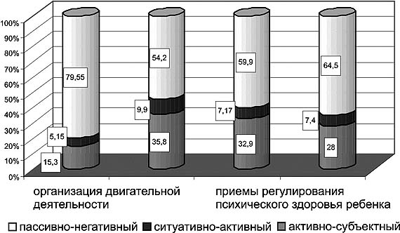Результаты анкетирования выявили недостаточную уверенность родителей в овладении практическими действиями по оздоровлению ребенка (28,2%) и повышению своего физического состояния (23%). Установлено, что большинство родителей в организации здоровой жизнедеятельности ребенка используют преимущественно гигиенические средства: режим дня - 53,4%, прогулки на свежем воздухе - 65,5%, рациональное питание - 37,9%. Занятия в спортивных секциях, кружках, спортивных клубах составляют - 20,6%; массаж - 12,06%, утренняя гимнастика - 10,3%, лечебная физическая культура - 6,9%; закаливающие процедуры используют в целом 36% опрошенных, в том числе обливание - 3,4%, купание - 6%, хождение босиком - 15,5% и т.д. Для повышения своего физического состояния родители используют в основном загородные прогулки (48,2%), рациональное питание (46,5%), лекарственные препараты (36,2%). Занятия плаванием, шейпингом, утренней гимнастикой и другими видами физических упражнений представлены весьма ограниченно в структуре образа жизни родителей, участвующих в опросе. Оценивая уровень валеологической грамотности в целом, подавляющее большинство опрошенных (65,5%) признались в недостаточно уверенном владении знаниями и практическими умениями по оздоровлению себя и своего ребенка. Для решения данной проблемы они основываются преимущественно на своем личном опыте (56,8%), информации участкового врача (50%), специальной литературе (34,4%) и средствах массовой информации (17,2%). Таким образом, приходится с сожалением констатировать, что семья, которая изначально должна закладывать в ребенке основные понятия и представления о здоровье, здоровом образе жизни, ответственности за свое здоровье и здоровье окружающих, сегодня не готова выполнять данную функцию. Результаты опроса показали неосведомленность родителей, ограниченность в целом уровня их знаний о здоровье ребенка, его физическом состоянии и средствах воздействия на них. Следующим этапом настоящего исследования было определение валеологической активности родителей, чьи дети посещают дошкольные образовательные учреждения. Критерий активности их участия в организации здоровой жизнедеятельности детей представлен тремя аспектами: 1) проведение профилактических мероприятий; 2) занятия физическими упражнениями; 3) использование приемов психорегуляции. Степень участия родителей определена тремя уровнями. Первый - активно-субъектный -уровень составили родители, систематически выполняющие данные мероприятия, активно участвующие в процессе воспитания здорового ребенка. Родители, принимающие участие в оздоровлении ребенка ситуативно, от случая к случаю, отнесены ко второму - ситуативно-активному - уровню. И третий - пассивно-негативный -уровень характеризует родителей, не принимающих участия в организации здоровой жизнедеятельности своих детей (см. таблицу). По данным исследования, больше всего родителей (64,5%) отнесены к пассивно-негативному уровню. Это семьи, отличающиеся низким уровнем валеологической культуры. Активно-субъектный уровень характерен лишь для 28% родителей, ситуативно-активный - для 7,4%. Анализируя степень участия членов семьи в организации двигательной деятельности своего ребенка, следует отметить крайне недостаточную их активность в занятиях различными видами физической культуры. В частности, отмечен крайне низкий показат