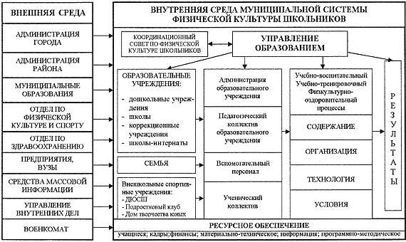наук В.В. Жгутова Ключевые слова: организация физической культуры школьников, муниципальная система. Современный этап развития социальной сферы в стране характеризуется значительными изменениями. Однако не все изменения принесли позитивные результаты. В последние годы четко обозначилось резкое ухудшение здоровья детей и подростков. Молодежную среду все больше охватывает табакокурение, употребление алкогольных напитков, наркомания. Воспитательный и оздоровительный потенциал физической культуры и детского спорта, возможности этой сферы в социализации детей, формировании здорового образа жизни ребенка недооцениваются. Переустройство общественной жизни в Российской Федерации обусловило модернизацию общего образования, совершенствование физической культуры и спорта и в этой связи постановку новых задач физического воспитания школьников. Существующая система физической культуры и спорта не может в полной мере решить новые задачи, что подчеркивалось на заседании Государственного совета Российской Федерации "О повышении роли физической культуры и спорта в формировании здорового образа жизни россиян" (январь, 2002 г.). Обострилась необходимость учета потребностей разных групп населения, в том числе детей и подростков, в физкультурно-спортивных услугах, удовлетворении запросов различных сфер социальной практики в физически здоровых людях, более эффективной реализации ресурсов, накопленных самой системой физической культуры и спорта. Отличительной чертой развития физической культуры и спорта в стране стали его регионализация и муниципализация. В их основе лежит территориальный принцип построения физкультурно-спортивного движения [1]. В связи с этим существует острая потребность в научном обосновании происходящих перемен. Понятие "система физической культуры" используется в научной литературе достаточно часто. В Федеральном законе "О физической культуре и спорте в Российской Федерации" (статья 2) это понятие определяется как совокупность государственных и общественных организаций, осуществляющих деятельность в целях физического воспитания населения и развития спорта в Российской Федерации. Однако это определение, формулируя цель государственных и общественных организаций, не раскрывает содержательной стороны этой деятельности. В специальной литературе по физической культуре и спорту этот вопрос также раскрыт не полностью. Например, в исследовании А.Г. Маркелова [3] рассматривается развитие физической культуры городского (муниципального) уровня. Но автор в своей работе не дает определения понятия муниципальной системы физической культуры и спорта, и можно сделать вывод, что городской и муниципальный уровни - это одно и то же. В монографии П.К. Пельменева [4] раскрываются механизмы развития физической культуры и спорта на региональном уровне, однако также нет понятия системы физической культуры и спорта на региональном уровне. Поскольку мы рассматриваем систему физической культуры школьников как нацеленную на образование учащихся в этой области знаний, обратимся к педагогической литературе, где понятие "образовательная система" наиболее разработано. В статье О.Е. Лебедева (1996) определены существенные признаки этого понятия. Прежде всего автор выделяет территориальную ограниченность образователь