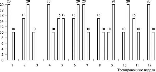 Планирование тренировочной нагрузки в экспериментальных упражнениях (20, 15 и 10 подъемов штанги за тренировочное занятие). Примечание. 20 - КПШ за тренировку весом в 70% от максимального, поднимаемого без помощи тренажера и 90% - с его помощью; соответственно 15 - КПШ весом в 80 и 100% и 10 - КПШ весом в 90 и 110% от максимального Планирование тренировочной нагрузки. Предварительные исследования показали, что большинство молодых атлетов достаточно уверенно выполняют упражнения со средним весом штанги (до 70-80 % от максимального). Тренировка же свыше этой нагрузки у многих молодых спортсменов нередко вызывала затруднения. Бывало и так, что атлет уверенно поднимает 3-4 раза подряд доступный для себя вес штанги, но не может осилить даже один раз вес, увеличенный, например, на 5-10 кг. Следовательно, нередко дело было даже не столько в недостатке силовой или технической подготовленности, сколько во влиянии отрицательного психического фактора, возникающего, как правило, у молодых, еще не опытных атлетов при попытке подъема штанги максимальных или субмаксимальных весов (из-за неуверенности в своих силах, боязни веса и т.п.). Известно, что даже у опытных атлетов возникают определенные трудности в преодолении этого фактора. На практике часто приходится затрачивать значительное время, чтобы атлет сумел одолеть свою неуверенность при подъеме штанги максимального веса. Но к тому времени потенциальные физические возможности данного спортсмена часто значительно опережают уровень их реализации на соревнованиях. С целью подтверждения эффективности применения технического средства для экспериментальной группы были определены три варианта тренировочной нагрузки: 1) 90 / 5х4; 2) 100 / 5х4; 3) 110/ 5х2, где 90, 100 и 110 - проценты от максимального результата; 5 - количество подходов; 4, 3, 2 - количество подъемов штанги (КПШ) за один подход. Следовательно, в течение одной тренировки КПШ составляло соответственно 20, 15 и 10. Контрольная группа выполняла тяжелоатлетические упражнения с применением следующих вариантов: 1) 70/5х4; 2) 80/5х3; 3) 90/5х2, где 70, 80 и 90 - проценты от максимального результата; 5 - количество подходов; 4, 3 и 2 - количество подъемов за один подход. Объем тренировки по КПШ в контрольной группе был таким же, что и у их сверстников из экспериментальной группы. Экспериментальные тяжелоатлетические упражнения выполнялись в недельном тренировочном цикле (при четырехразовых занятиях) два раза. Распределение нагрузки в этих упражнениях показано на рисунке. Экспериментальные упражнения с одной и той же нагрузкой выполнялись в течение трех месяцев: 90 и 70% от максимального (для экспериментальной и контрольной групп) - на восьми тренировочных занятиях, 100 и 80% - на семи и в 110 и 90% - на девяти тренировках. Итого в период эксперимента было запланировано 24 таких занятия. Количество подъемов штанги для каждого варианта нагрузки составляло соответственно 160, 105 и 90 за три месяца. На наш взгляд, такой объем тренировочной нагрузки в одном упражнении в течение двух месяцев был достаточен, чтобы оценить эффективность экспериментальной методики тренировки. Особенности силовой подготовки юных атлетов. В отличие от целого ряда подобных тренажеров, обеспечивавших подъем штанги в изокинетическом режиме, т.е. при постоянном воздействия груза, который через блок тянет штангу вверх, в нашем приспособлен