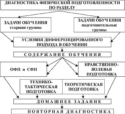 основополагающим принципом является Помня о необходимости реализации права каждого ребенка на полноценное физическое развитие, аспекты обучения играм с элементами спорта строят с учетом разного уровня развития и исходных данных физического состояния каждого ребенка, а также конкретных природных и климатических условий региона. Структурно -функциональную модель программы "Играйте на здоровье" можно представить в виде схемы. Каждый из 11 разделов программы начинается с диагностики (оценки реального уровня готовности детей к овладению данным видом двигательной деятельности) и заканчивается диагностикой (оценкой достигнутых в обучении результатов), то есть взаимоотношения управляющей и управляемой подсистем планируют на основе объективной информации об основных параметрах физического состояния управляемой подсистемы. Незначительная эффективность реализации поставленных в современных программах задач по обучению дошкольников играм с элементами спорта объясняется отсутствием процессуальных блоков, характеризующих их реализацию. Поэтому параллельно с разработкой и апробацией программы мы готовили методические рекомендации к ее осуществлению. С учетом концепции формирования физической культуры человека (Л.И. Лубышева, 1992) в целях социально-нравственного воспитания, формирования жизненной философии, убежденности, потребностно -деятельностного отношения к освоению ценностей физической культуры, в каждый из 11 разделов программы и методических рекомендаций включен блок "Теоретическая подготовка", в котором определяются темы и содержание бесед с детьми, дается информация на доступном для дошкольников уровне, а именно: история возникновения игр, национальное отношение к играм с элементами спорта, достижения и успехи России, местных спортсменов в данной области спорта. Включается познавательный материал: какие бывают мячи и зачем мяч нужен человеку, почему игра называется так или иначе, из каких материалов изготовлен инвентарь для игр? Планируют беседы о коллективных действиях в команде, организации взаимопомощи в обучении, оказании первой помощи при ушибах, травмах.