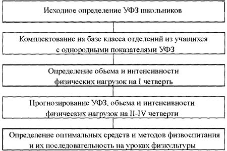 Рис. 1. Основные компоненты физкультурно-оздоровительной методики Для того чтобы учащиеся при выполнении упражнений на уроке физкультуры находились в равных условиях, целесообразно разделить их на отделения с учетом индивидуальных показателей УФЗ. В каждом экспериментальном классе учащиеся были разделены на 6 отделений (по 3 девочек и мальчиков). Отделения состояли из учащихся с однородными показателями УФЗ. В каждом отделении было по 3-4 школьника. Комплектование учащихся по отделениям с учетом индивидуальных показателей УФЗ происходило следующим образом. Например, в классе 24 ученика (12 мальчиков и 12 девочек). Первое отделение учащихся формируется из 4 мальчиков с самыми низкими показателями УФЗ, второе - из 4 мальчиков с последующими показателями УФЗ, третье - из мальчиков с наилучшими показателями УФЗ. Аналогичным образом формируются 3 отделения девочек. Так же в каждом отделении определялось среднее значение УФЗ. В начале учебного года нами определялись объем и интенсивность физической нагрузки на уроках физической культуры для школьников. Объем физической нагрузки на уроке (его моторная плотность) для учащихся ЭГ определялся на основании уравнений линейной регрессии, разработанных В.А. Медведевым [8] (формула 1, 2). В расчетах использовались средние значения УФЗ школьников. МП = -37,23 + 2,466*УФЗ + 0,448*ЧСС (1) МП = -37,05 + 3,133*УФЗ + 0,385*ЧСС, (2) где МП - моторная плотность урока, УФЗ - уровень физического здоровья по Г.Л. Апанасенко [1], баллы; ЧСС - средняя величина ЧСС на занятиях в течение моделируемого интервала, уд/мин. Оптимизация интенсивности физической нагрузки упражнений, выполняемых в аэробной зоне энергообеспечения, реализовывалась при помощи математического моделирования. Уравнения множественной линейной регрессии (модели) для определения оптимальной интенсивности физических упражнений выглядят следующим образом: Упражнение 1 Бег (колич. беговых шагов). И (мальчики) = 117,44 + 1,17 * УФЗ + 0,17 * ЧСС (3) И (девочки) = 129,49 + 0,82 * УФЗ + 0,08 * ЧСС, (4) где И - интенсивность выполнения упражнения (колич. беговых шагов/мин). Упражнение 2 Прыжки через скакалку (колич. раз). И (мальчики) = -51,56 + 1,56* УФЗ + 1,25* ЧСС (5) И (девочки) = -34,86 + 1,32* УФЗ + 1,14* ЧСС, (6) где И - интенсивность выполнения упражнения (колич. раз/мин). Упражнение 3 Степ-тест (колич. раз). И (мальчики) = - 18,72 + 0,78 * УФЗ + 0,9 * ЧСС (7) И (девочки) = -10,97 + 1,16 * УФЗ + 0,83 * ЧСС, (8) где И - интенсивность выполнения упражнения (колич. раз/мин). Упражнение 4 Бег на месте (колич. раз). И (мальчики) = - 29,03 + 1,23 * УФЗ + 1,31 * ЧСС (9) И (девочки) = -12,85 + 1,43 * УФЗ + 1,18 * ЧСС. (10) Упражнение 5 И.п - полувыпад правой. Прыжком смена положения ног (кол. раз). И (мальчики) = 40,3 + 0,41 * УФЗ + 0,43 * ЧСС (11) И (девочки) = 20,8 + 0,52 * УФЗ + 0,55 * ЧСС, (12) где И - интенсивность выполнения упражнения (колич. раз / мин). Упражнение 6 И.п. - о.с. 1 - прыжком ноги врозь, руки вверх; 2 - и.п. (колич. раз). И (мальчики) = -18,62 + 2,13* УФЗ + 0,5* ЧСС (13) И (девочки) = - 14,67 + 0,39* УФЗ + 0,45* ЧСС, (14) где И - интенсивность выполнения упражнения (колич. раз/мин). Исходя из того что минимальной тренирующей нагрузкой, способствующей повышению функциональных возможностей кардиореспираторной системы, является нагрузка при ЧСС 130-135 уд/мин, а максимальной - 160-170 уд/ мин [8], было выдвинуто следующее предположение. Для учащихся с очень низким УФЗ интенсивность физической нагрузки при выполнении аэробных физических упражнений будет оптимальной п
