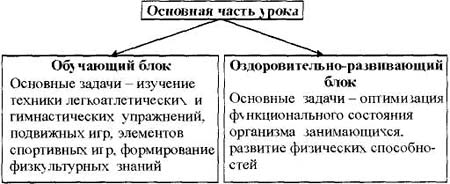 Рис. 2. Структура основной части уроков Основная часть урока условно была разделена на два блока (рис. 2). Выполнение физических упражнений в основной части урока осуществлялось преимущественно в аэробной зоне энергообеспечения. Учебный материал по изучению техники легкоатлетических и гимнастических упражнений, обучению подвижным играм, элементам спортивных игр, а также формированию физкультурных знаний соответствовал требованиям комплексной программы по физическому воспитанию учащихся 1-4-х классов. Обучение двигательным умениям и навыкам, развитие физических способностей школьников осуществлялось по общепринятым методикам. Структура построения основной части занятий была следующей. В начале изучалась техника легкоатлетических упражнений (в I и IV четвертях* гимнастических упражнений (во II четверти), элементов спортивных и подвижных игр (в III четверти), а также формировались физкультурные знания (блок I). На выполнение всех заданий в этом блоке отводилось 10-15 мин. Преимущественно использовались фронтальный и групповой методы. Далее решались задачи оптимизации функционального состояния организма занимающихся и развития их физических способностей (блок II). В II блоке последовательность применяемых средств и методов была следующей. В начале учебной четверти школьники были разделены на 6 отделений с однородными индивидуальными показателями УФЗ. Первое и третье отделения выполняли аэробные упражнения заданной с помощью звукового сигнала по секундомеру интенсивностью. Пятое отделение выполняло упражнения, направленные на развитие силы. Второе и шестое отделение выполняли упражнения направленные на развитие гибкости. Четвертое отделение выполняло дыхательные упражнения. Упражнения на станциях выполнялись 2 мин. Непременным условием при реализации блока II в основной части урока было чередование упражнений высокой и низкой интенсивности при использовании метода круговой тренировки. Каждое упражнение выполнялось 2 мин. После прохождения всех станций учащимся предлагались эстафеты и подвижные игры, направленные на развитие общей выносливости, силы, быстроты, ловкости, скоростно-силовых способностей. Использовался игровой метод. На выполнение всех заданий в этом блоке отводилось 15-20 мин. Последние два урока в каждой четверти отводились на тестирование физической подготовленности школьников. Заключительная часть. Структура заключительной части урока была общепринятой. Сначала выполнялись упражнения для снижения возбуждения сердечно-сосудистой, дыхательной, нервной систем, уменьшения напряжения мышечных групп. Использовались медленный бег, различные виды ходьбы, упражнения на расслабление, внимание, правильную осанку. В конце заключительной части подводились итоги урока: выставлялись отметки, давались домашние задания. Продолжительность заключительной части составляла 2-3 мин. Разработанная нами методика способствовала более эффективному решению оздоровительных задач, чем общепринятая структура организации и проведения занятий по физическому воспитанию. У школьников, принявших участие в педагогическом эксперименте, произошли положительные сдвиги в показателях физического развития и функционального состояния сердечно-сосудистой, дыхательной и мышечной систем организма. В течение учебного года